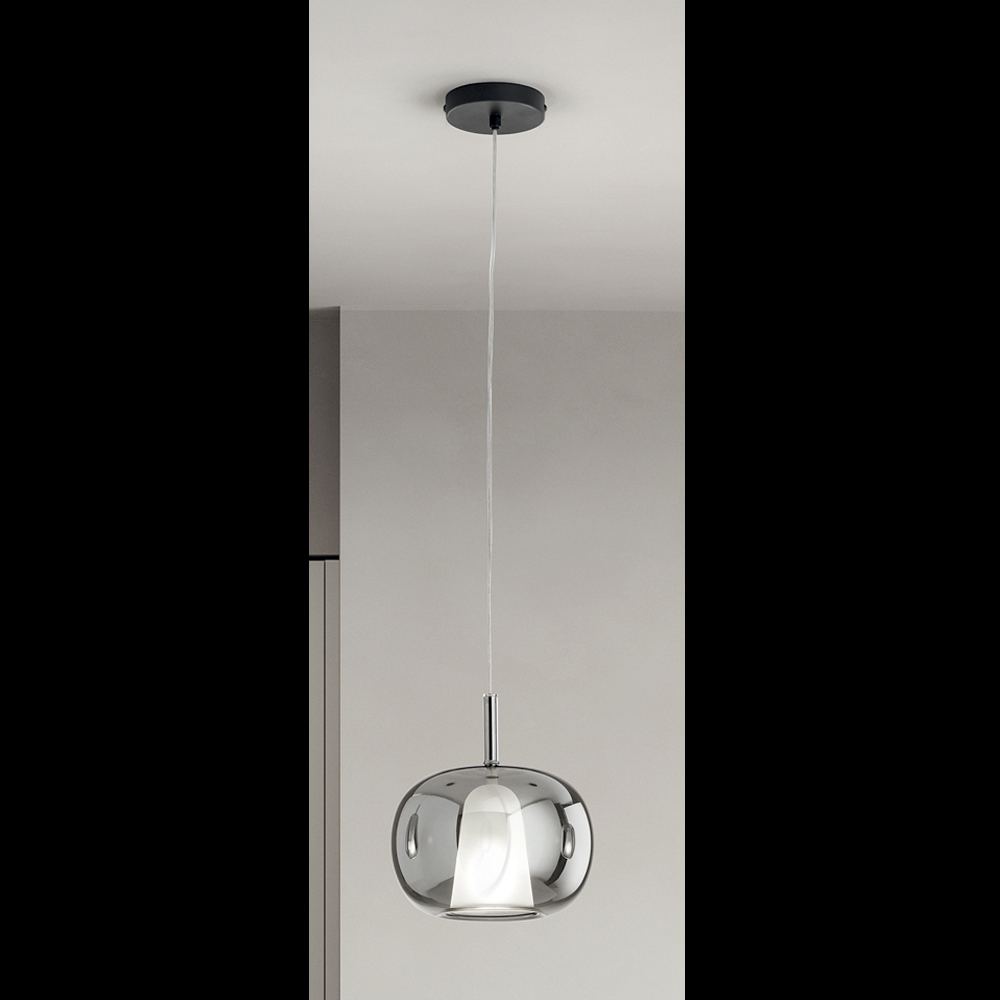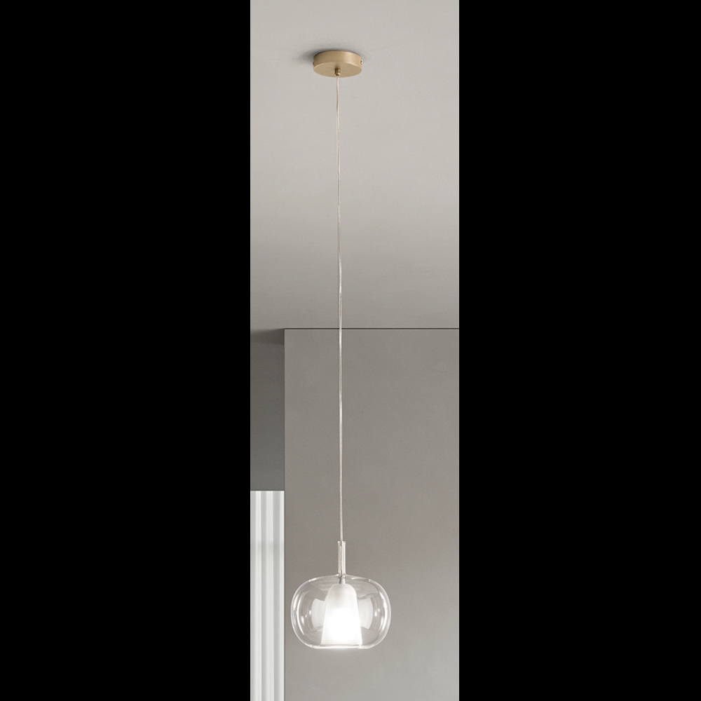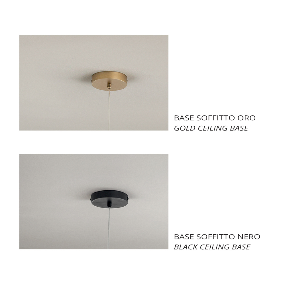 Llambë e punuar me një bazë tavani metalik dhe difuzor xhami të fryrë , i karakterizuar nga një shtresë e dyfishtë: e brendshme në xhami saten dhe e jashtme në xhami me ngjyrë . Kapak me material polimer për të stabilizuar kabllon në një pozicion qendror. Kabllo e rregullueshme.