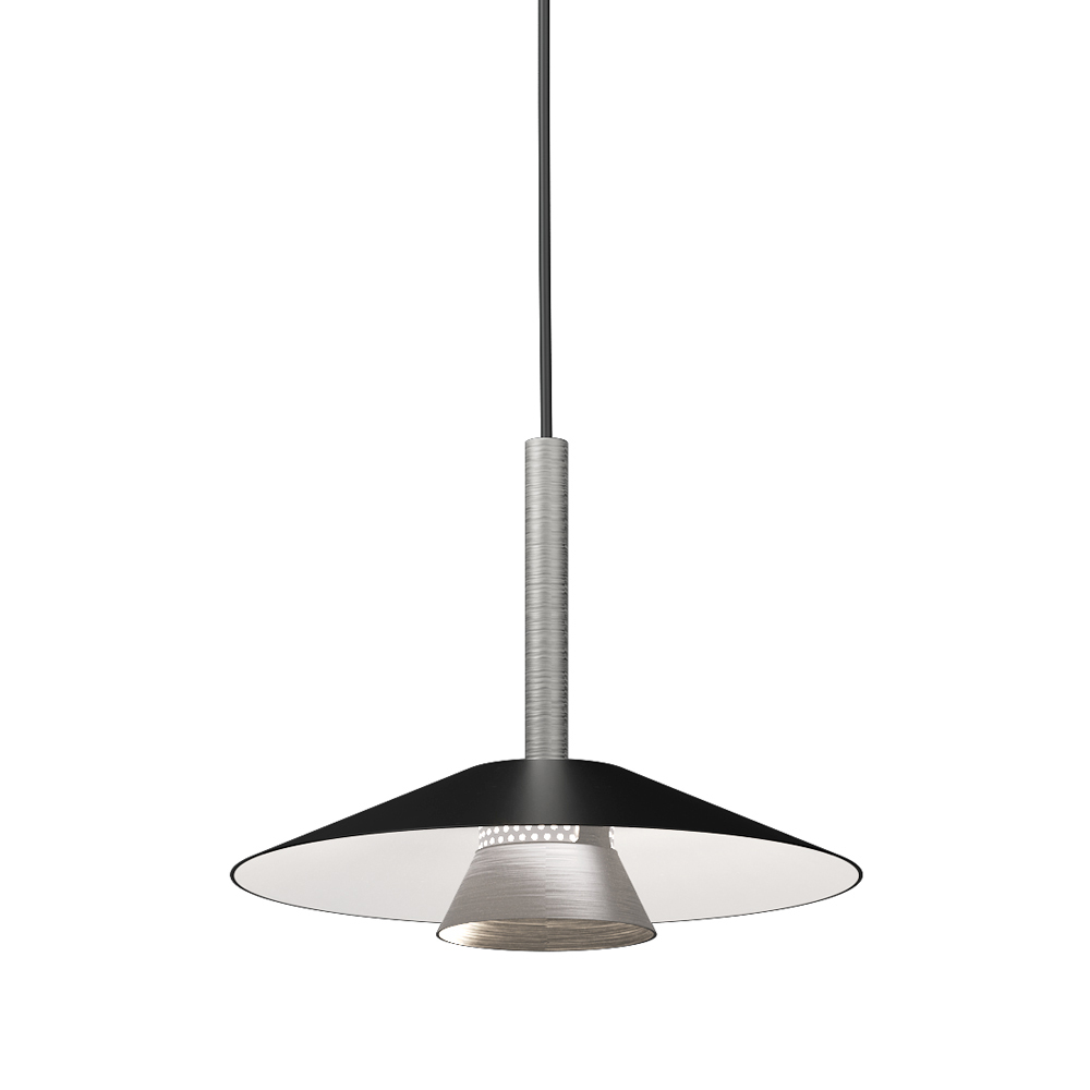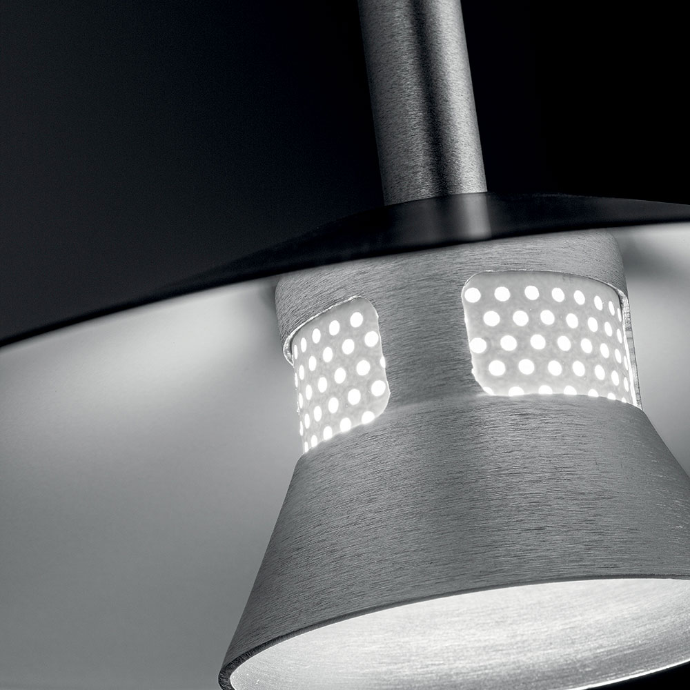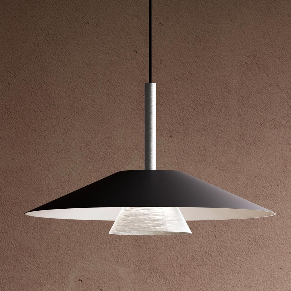 Kjo llambë është një bashkim perfekt i dizajnit bashkëkohor dhe elegancës industriale , e projektuar për ata që duan detajet e rafinuara dhe një estetikë të guximshme. Struktura gjeometrike, me një difuzor konik dhe një disk të madh reflektues, krijon një lojë interesante vëllimesh dhe kontrastesh , duke siguruar një dritë të drejtuar dhe mbështjellëse .
