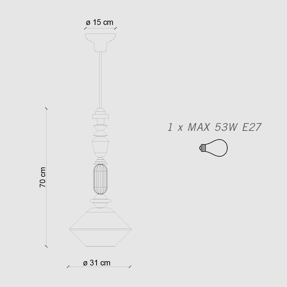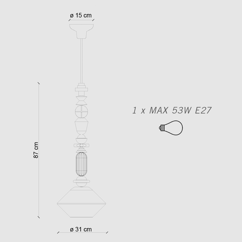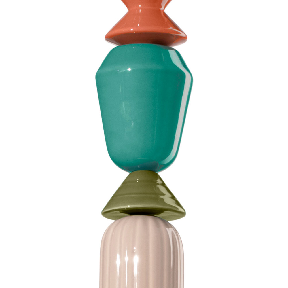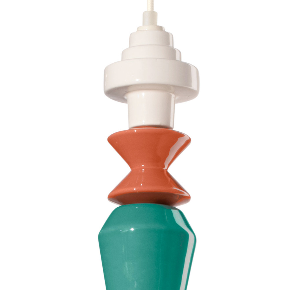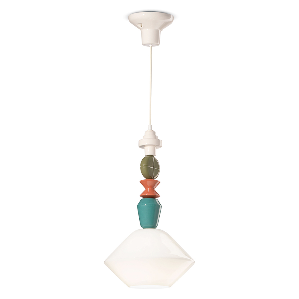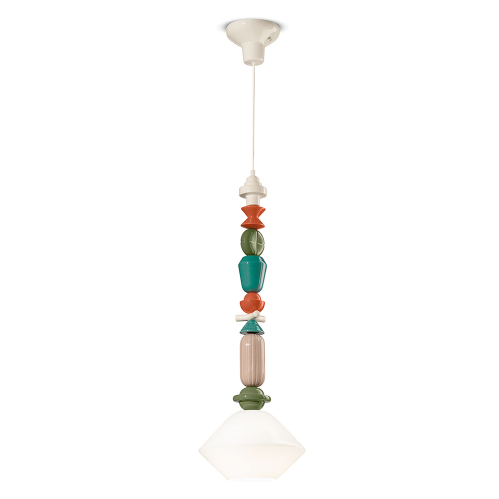 Kjo llambë varëse është një vepër arti ndriçuese që ndërthur ngrohtësinë e qeramikës me transparencën e xhamit. Me format e saj gjeometrike dhe sekuencën e elementeve me ngjyra , kjo mobilje është si një totem drite dhe ngjyra që i shton personalitet dhe gjallëri çdo dhome.