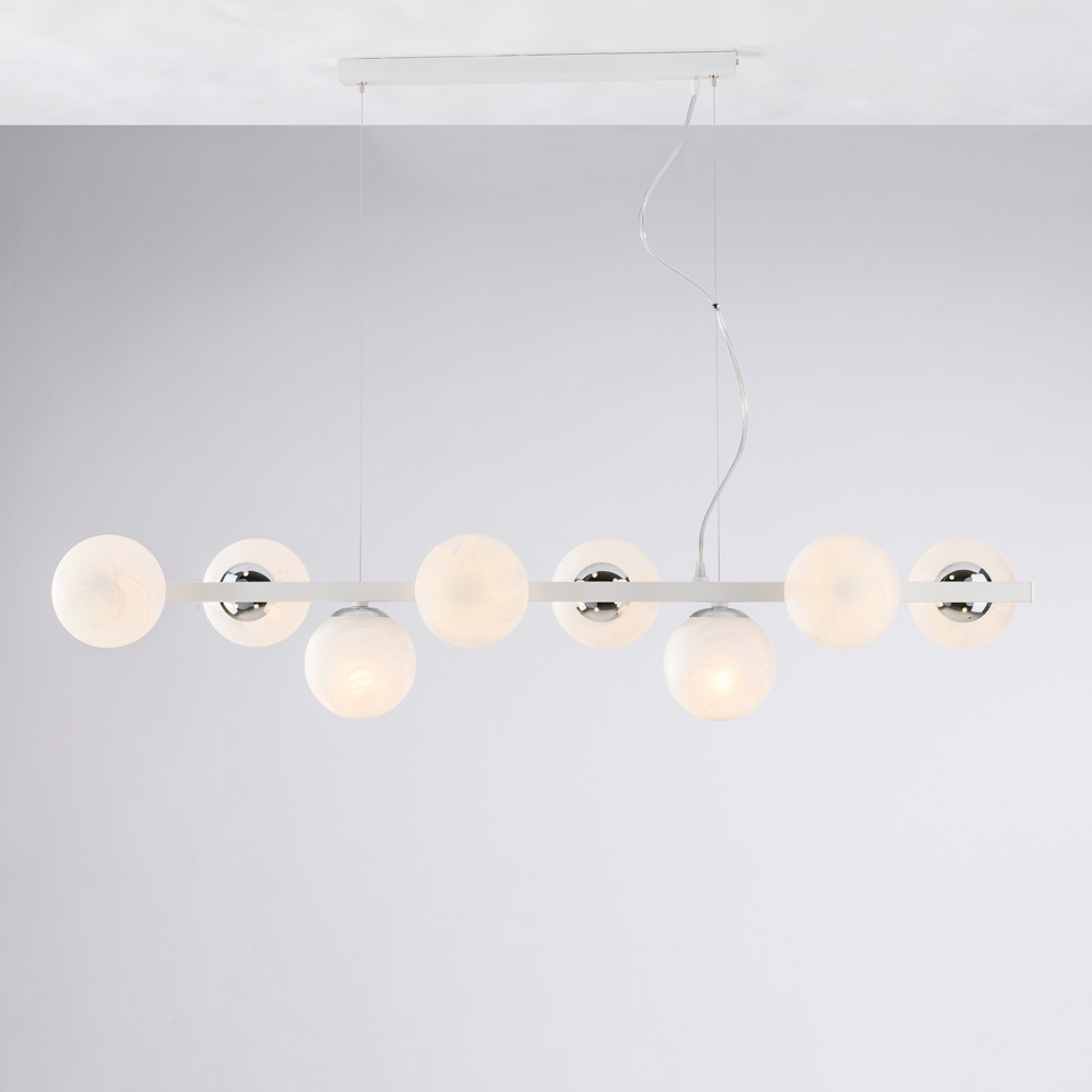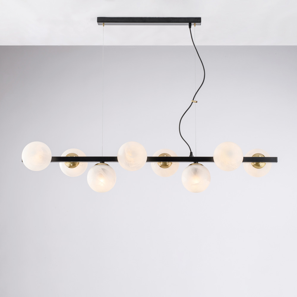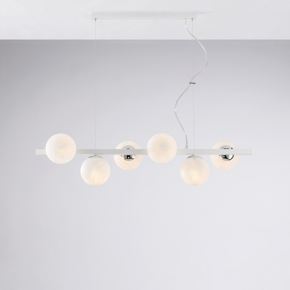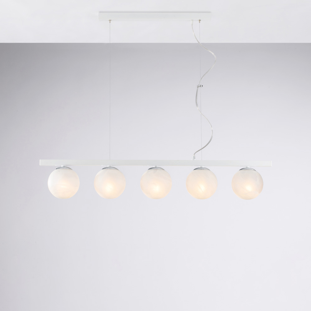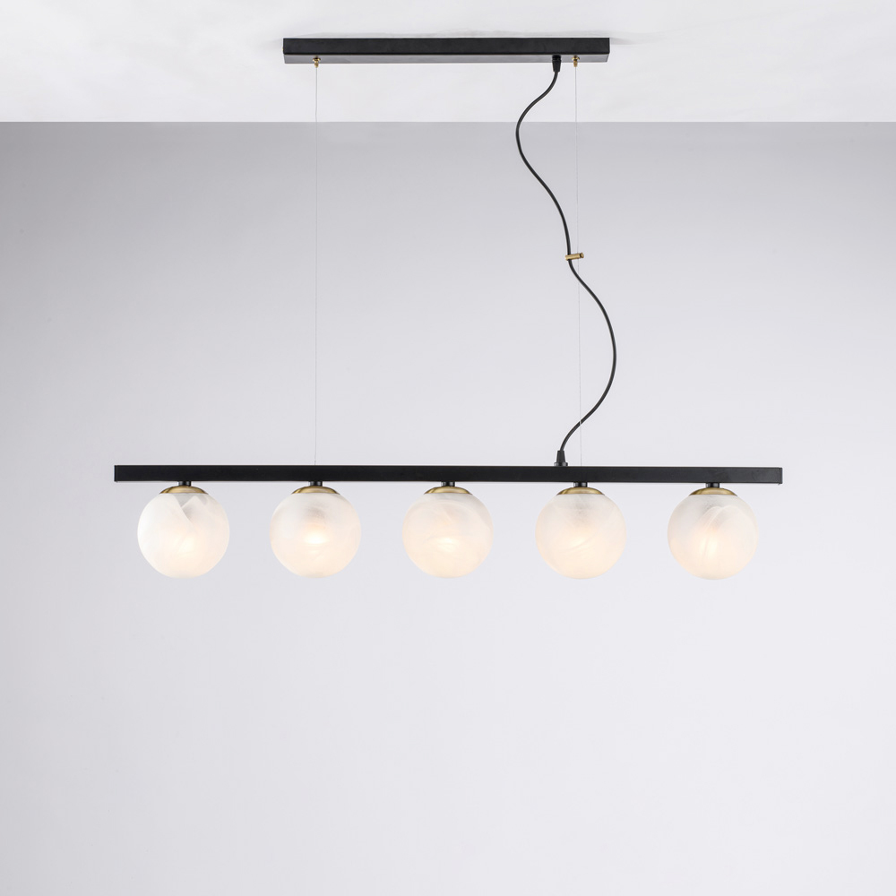 Moderne, elegante dhe vizualisht mbresëlënëse, kjo llambë varëse prej hekuri e punuar me dorë është projektuar për të pasuruar hapësirat bashkëkohore me një dritë të shpërndarë dhe dramatike. Struktura lineare, e përforcuar nga sferat ndriçuese të njëpasnjëshme , krijon një ekuilibër të përsosur midis rigorozitetit gjeometrik dhe butësisë vizuale.