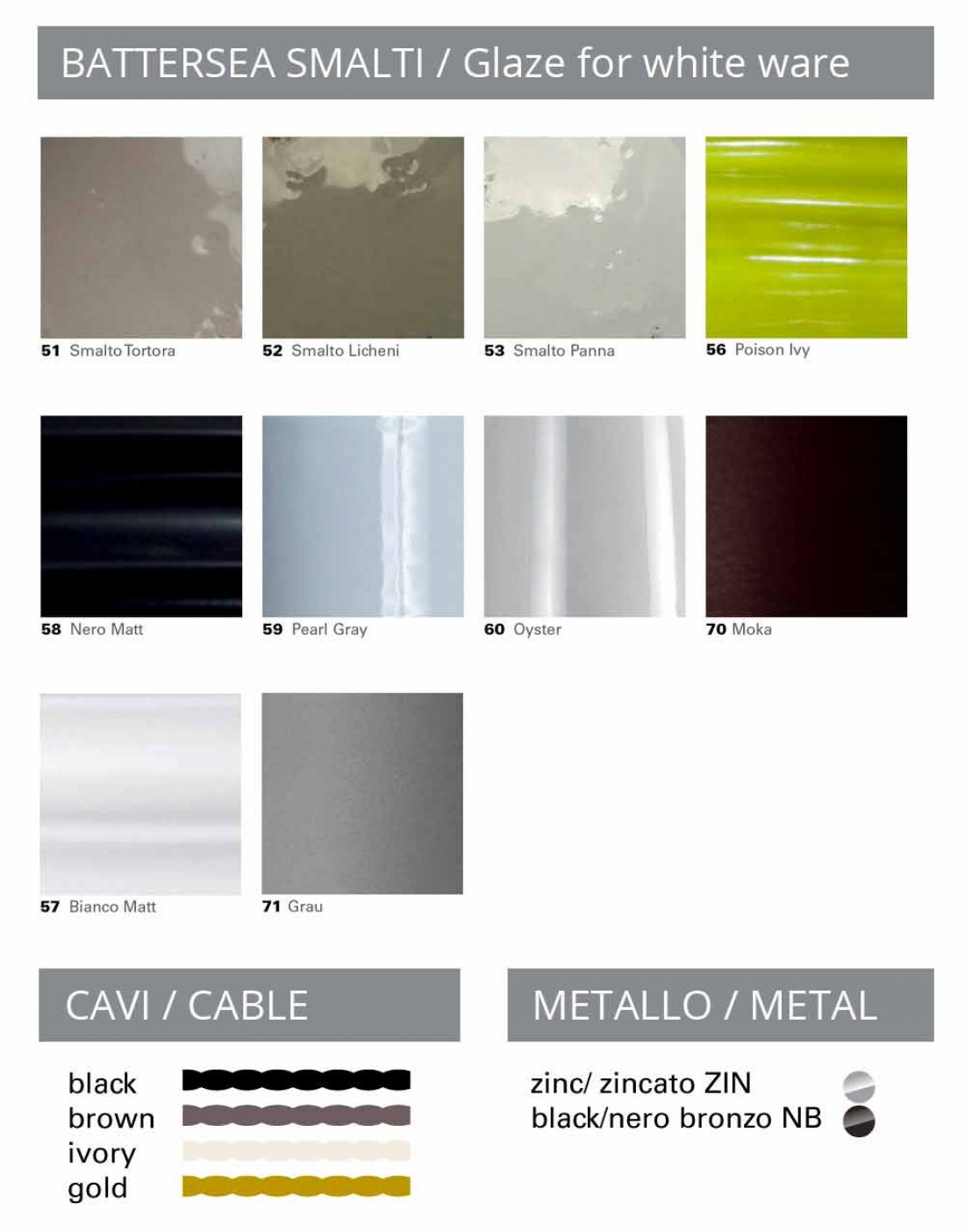 Llambë varëse qeramike Toscot Battersea, dizajn modern i bërë në Itali Llambë varëse qeramike, e punuar me dorë në Toscana. Battersea është punuar me dorë nga zejtarë të aftë me materiale me cilësi të shkëlqyera, sipas traditës toskan. Dritë direkte. Pranvera metalike e bën këtë llambë edhe më unike dhe origjinale! Llamba është në dispozicion në përfundime dhe hije të ndryshme. Ju mund ta rregulloni Battersea duke zgjedhur ngjyrën e shiritit, të pranverës metalike dhe të kabllit elektrik. Shkruani në kutinë e duhur ngjyrat e zgjedhura.