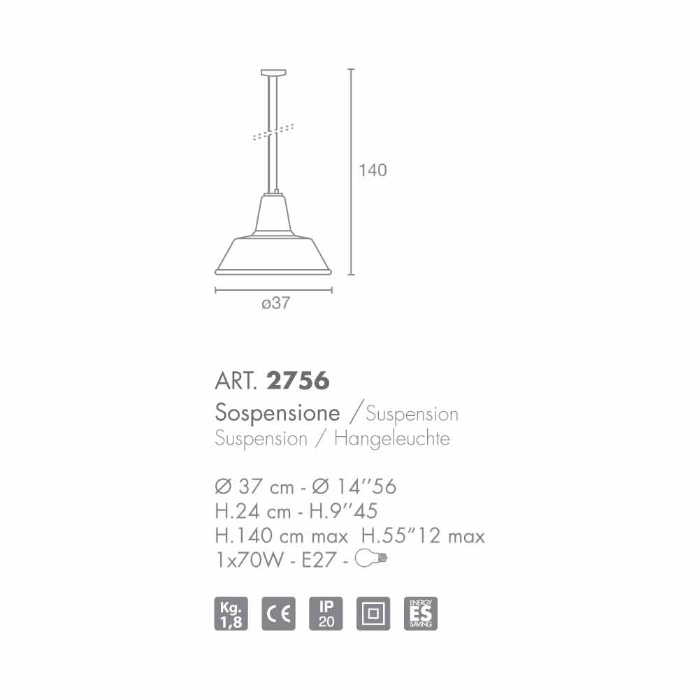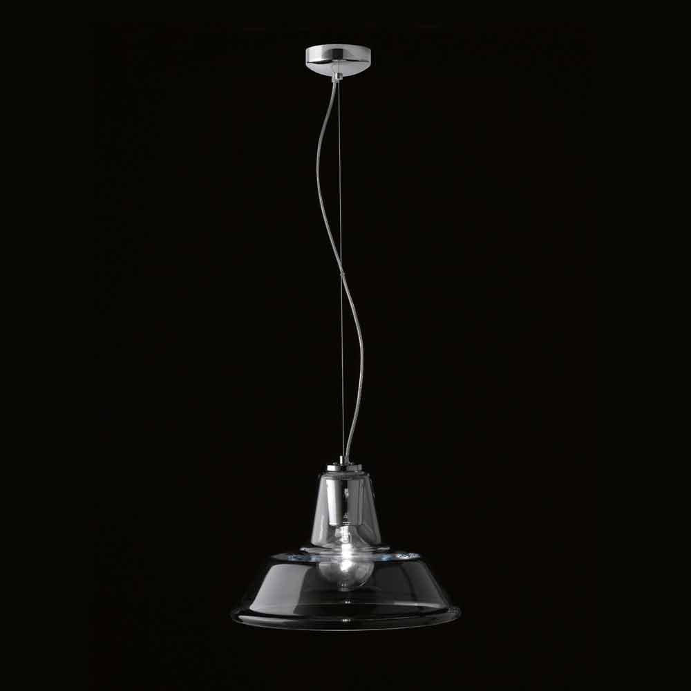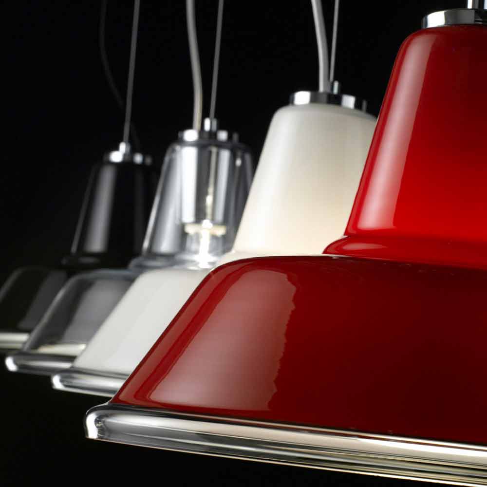 Llambë varëse me një dizajn industrial të njohur por që krijohet nga një shpërndarës special i qelqit në lulëzim. Përfundimet në dispozicion janë: transparente, të bardha, të zeza ose të kuqe, me kornizë kromi ose bakri.