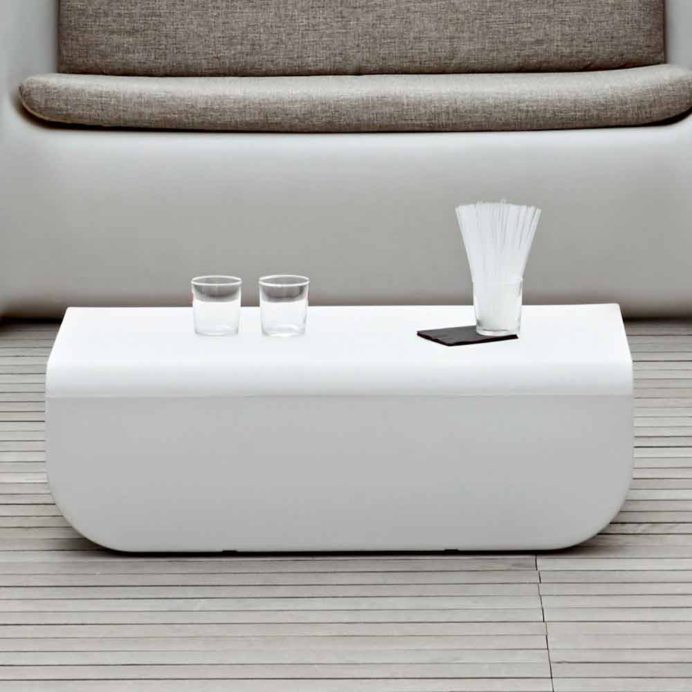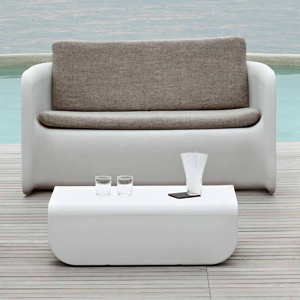 Kopshti modern i kopshtit, divani dhe tavolina e kafesë me dizajn në polieasy të prodhuara në Itali.