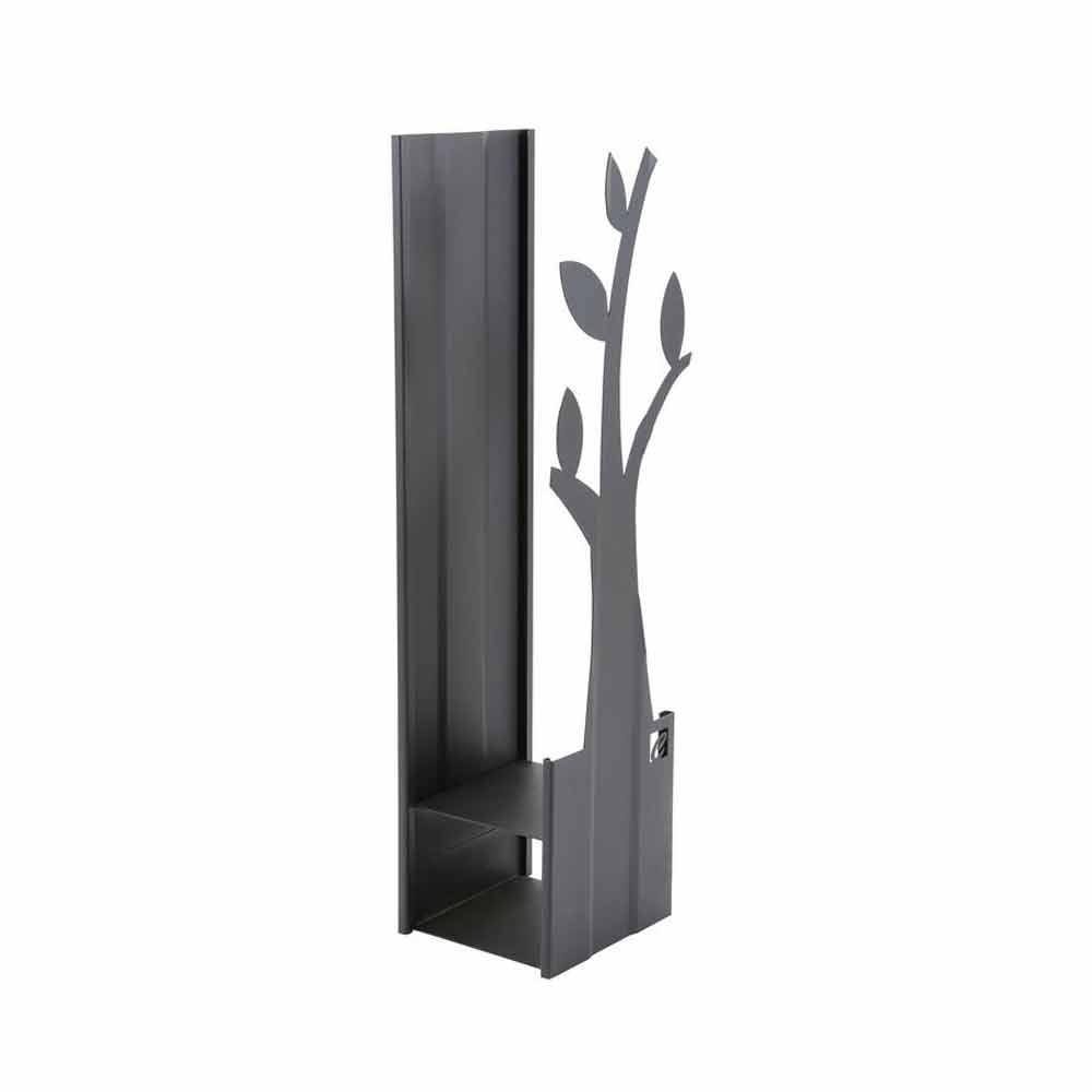 Mbajtës modern i druve të zjarrit në çelik jo-toksik i veshur me pluhur me cilësi të lartë. Projektuar, dizenjuar dhe punuar me dorë në Itali, me synimin për të nxjerrë në pah jo vetëm dobinë e vetë mbajtësit të trungut, por edhe vlerën e tij estetike.