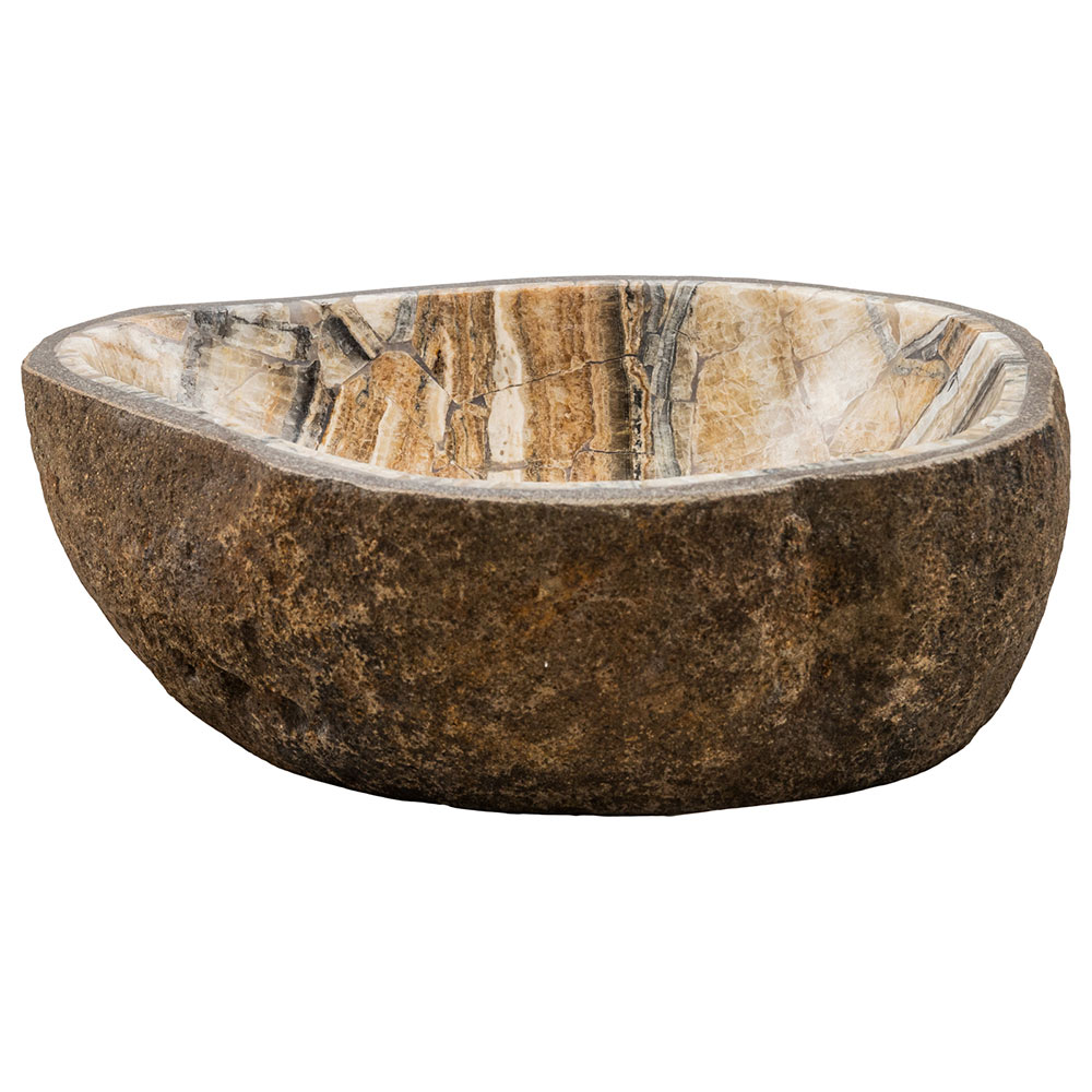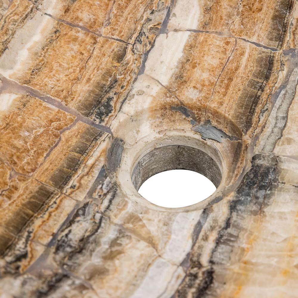 Palata është një lavaman countertop i punuar me dorë në gur lumi me një mozaik prej guri oniksi brenda.