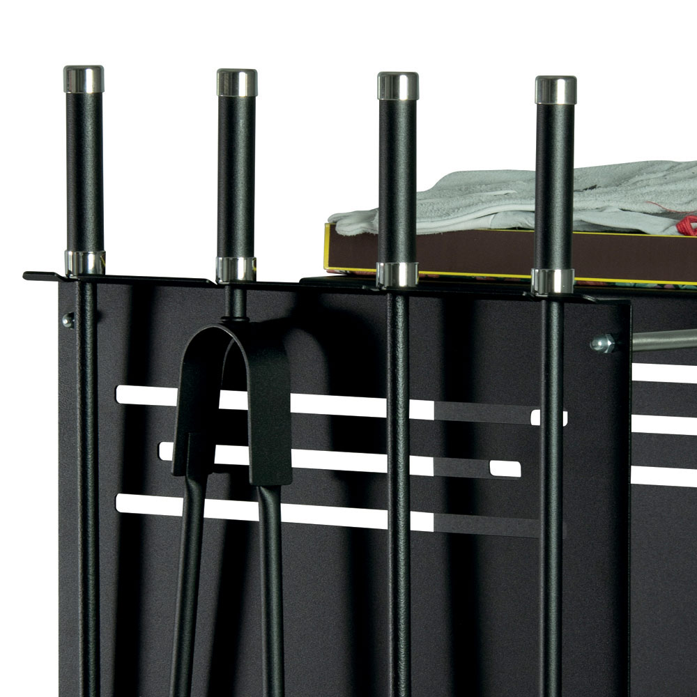 Kjo mbajtëse shumëfunksionale për dru zjarri është një aksesor thelbësor për adhuruesit e oxhakut. E ndërtuar me një strukturë të fortë metalike, është e pajisur me rrota për të lehtësuar lëvizjen. Njësia jo vetëm që shërben për të mbajtur një sasi të mirë drush zjarri, por ofron edhe hapësirë të dedikuar për mjetet e nevojshme për menaxhimin e zjarrit: një lopatë, një furçë, një kapëse dhe një grep, duke ruajtur kështu rendin dhe praktikën.