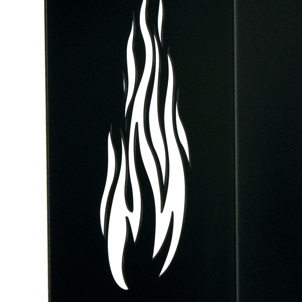 Kjo mbajtëse metalike për trungje kombinon funksionalitetin praktik me një dizajn tërheqës për të pasuruar hapësirën e oxhakut tuaj. Struktura e zezë është rezistente dhe e fortë, e projektuar për të akomoduar një sasi të bollshme druri. Prerjet e flakës në anët jo vetëm që shërbejnë si elementë dekorativë, por sigurojnë edhe ventilim të duhur, thelbësor për mbajtjen e drurit të thatë.