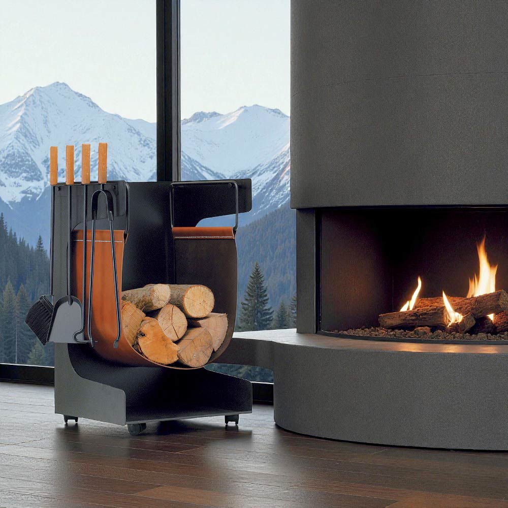 Kjo mbajtëse metalike për trungje është shembulli i funksionalitetit që takohet me elegancën. Dizajni i saj i zgjuar jo vetëm që shërben si një kuti e dobishme për ruajtjen e drurit, duke i mbajtur trungjet tuaja të rregullta dhe në dispozicion, por gjithashtu përfshin një set veglash për oxhakun , të vendosura me kujdes në mbajtëse vertikale për akses të lehtë: një furçë, një kosh pluhuri, një grep dhe një kapëse .
