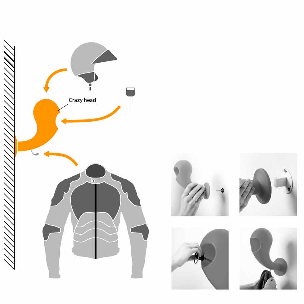 Një risi absolute, mbajtësi i përkrenares Crazy Head është i destinuar të bëhet një domosdoshmëri e domosdoshme në shtëpitë e entuziastëve të motoçikletave, skuterëve dhe biçikletave. Propozuar nga Myyour si një mobilje origjinale dhe argëtuese, ajo shndërron funksionalitetin e saj në shumëfunksionalitet falë ndarjes së zbrazjes së xhepit dhe varëses praktike të veshjes. Mund të përdoret gjithashtu si një mbajtëse kapelë inovative dhe me stil.