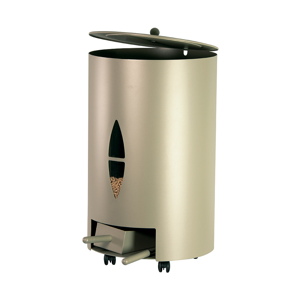 Kjo mbajtëse peleti oxhaku shquhet për dizajnin cilindrik dhe modern , përshtatet lehtësisht me çdo ambient shtëpie. Struktura e fortë metalike siguron forcë dhe jetëgjatësi, ndërsa rrotat e integruara sigurojnë lëvizje të lehtë. Enë është e pajisur me një kapak të sipërm , i cili mbron peletat nga lagështia dhe pluhuri, duke e mbajtur atë të thatë dhe gati për përdorim. Për më tepër, dritarja e përparme jo vetëm që shton një prekje estetike, por ju lejon të monitoroni nivelin e peletit pa pasur nevojë të hapni kontejnerin. Ky mbajtës peleti është zgjidhja ideale për ata që kërkojnë prakticitet, pastërti dhe stil në ngrohjen e shtëpisë.