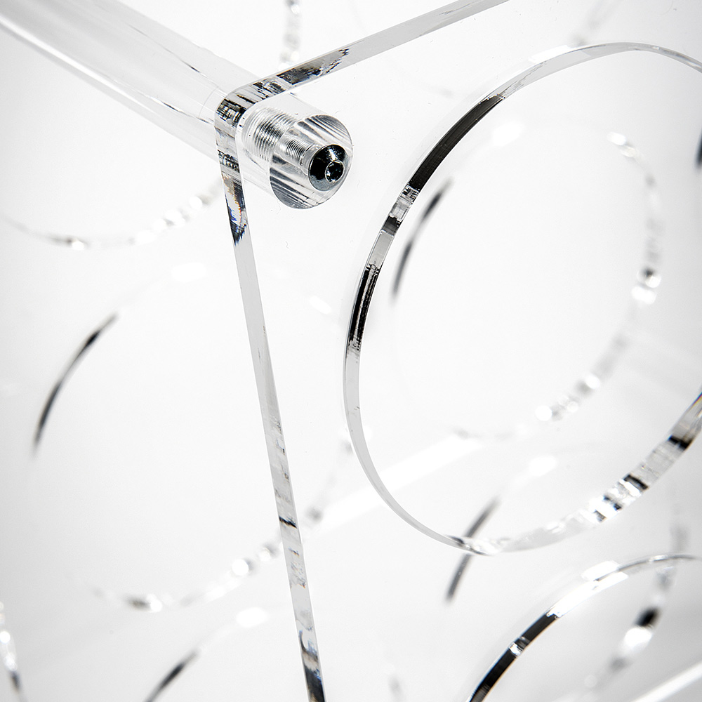 Raft shishe në dysheme tërësisht i prodhuar në Itali në pleksiglas PMMA 100% nga polimer i virgjër dhe një gjethe esence druri, ju lejon të ruani deri në 12 shishe verë dhe shampanjë. Praktik për mbajtjen në rregull të verërave dhe pijeve, shërben në mënyrë perfekte si një pjesë e dizajnit të mobiljeve falë estetikës së tij funksionale dhe formës origjinale që të kujton formën e një fuçie vere.
