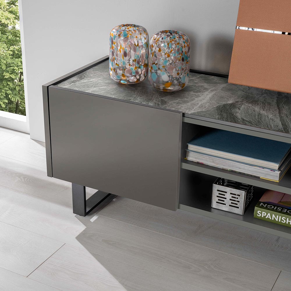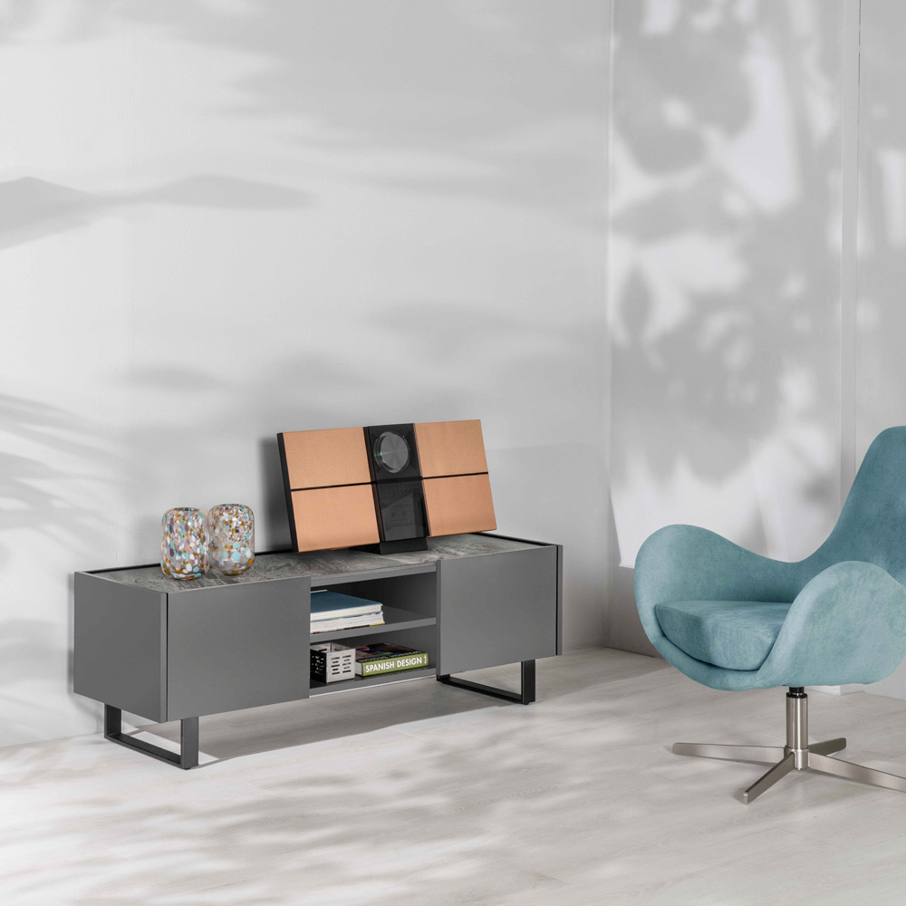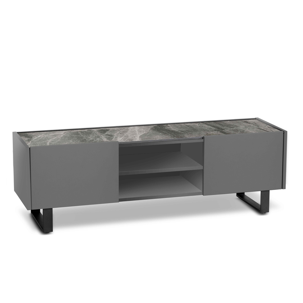 Kabineti i brendshëm i televizorit i bërë me majë qeramike me efekt mermeri gri , strukturë MDF me rimeso gri të errët , këmbë metalike,2 dyer me mbyllje të butë dhe 2 ndarje të hapura . Klasike dhe e këndshme, kjo mobilje MDF me rimeso dallohet për karakterin e saj modern dhe linjat e pastra. Pjesa e sipërme qeramike me efekt mermeri mbështetet në strukturën e rafinuar dhe diskrete. Mekanizmi i mbylljes së butë e bën këtë artikull të përputhshëm me shtëpitë moderne që favorizojnë funksionalitetin, pa hequr dorë nga një prekje e klasit.