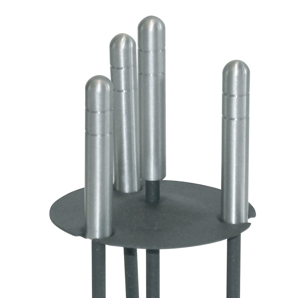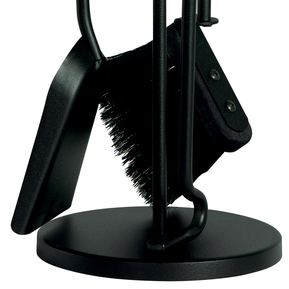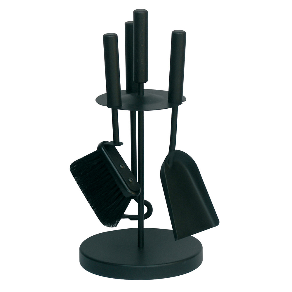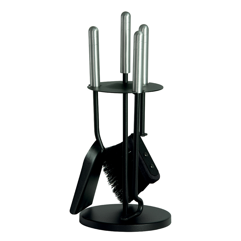 Korniza e hollë por e qëndrueshme mban me hijeshi 3 aksesorë, të gjithë me doreza të forta që sigurojnë përdorim të lehtë dhe qëndrueshmëri . Dizajni kompakt ju lejon të vendosni kompletin pranë oxhakut pa zënë vend, ndërsa baza e rrumbullakët siguron stabilitet dhe rregull.