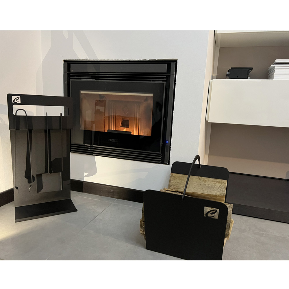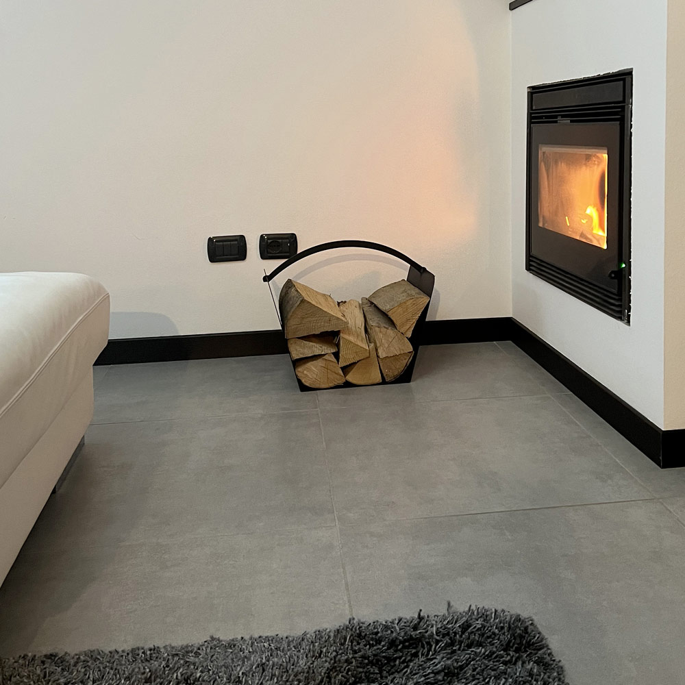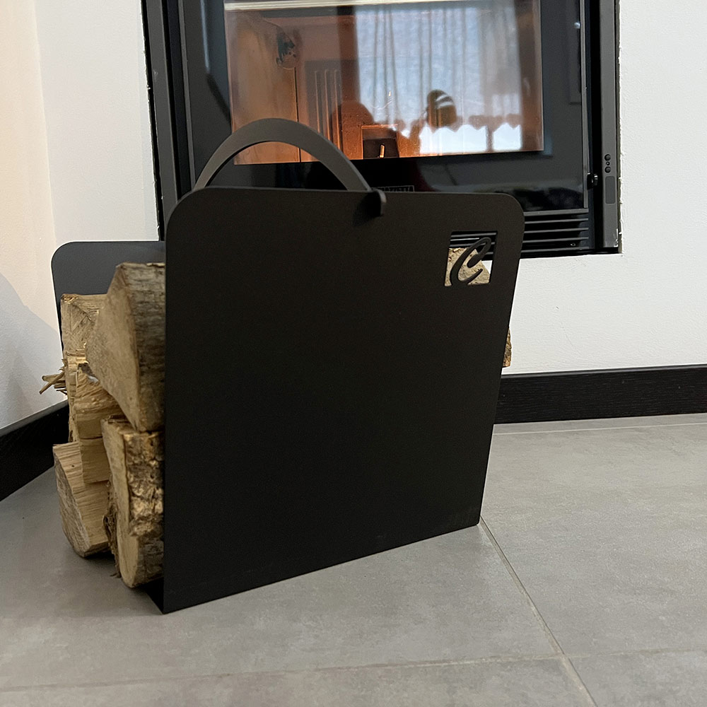 Portalegna për fireplace dizajn bërë nga ersekë jo-toksike të notave çeliku pluhur-veshura. Projektuar, dizenjuar dhe punuar me dorë në Itali, me synimin për të nxjerrë në pah jo vetëm dobinë e vetë mbajtësit të trungut, por edhe vlerën e tij estetike, me modelin e tij minimal në formën e një shporte të stilizuar.
