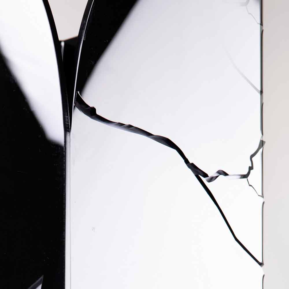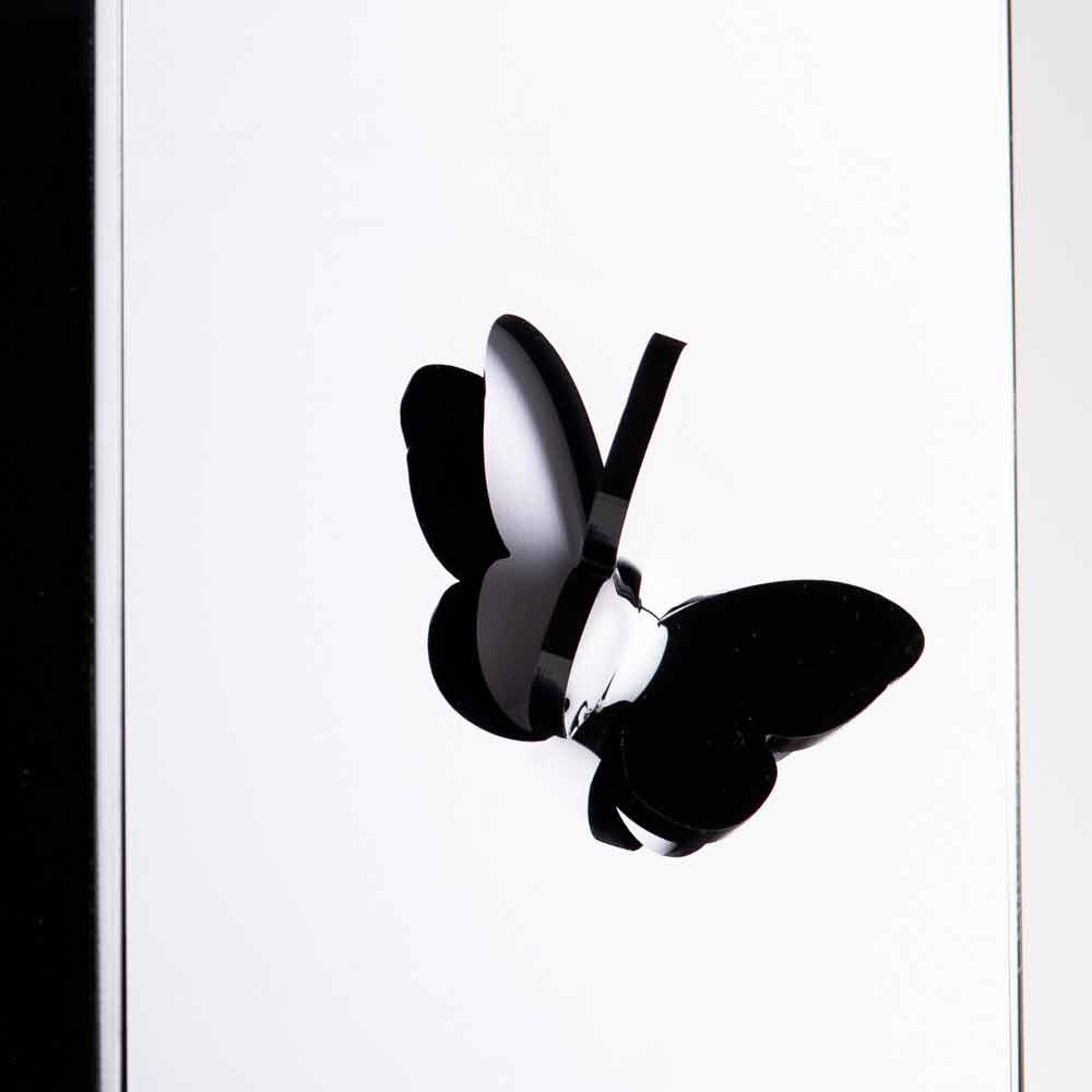 Mbështetja e ombrellës në pleksiglas të zi karakterizohet nga përfaqësimi i degëve të dimrit të shënuara me lazer dhe fluturave të zbukuruara tre-dimensionale dhe bazës prej çeliku inox.