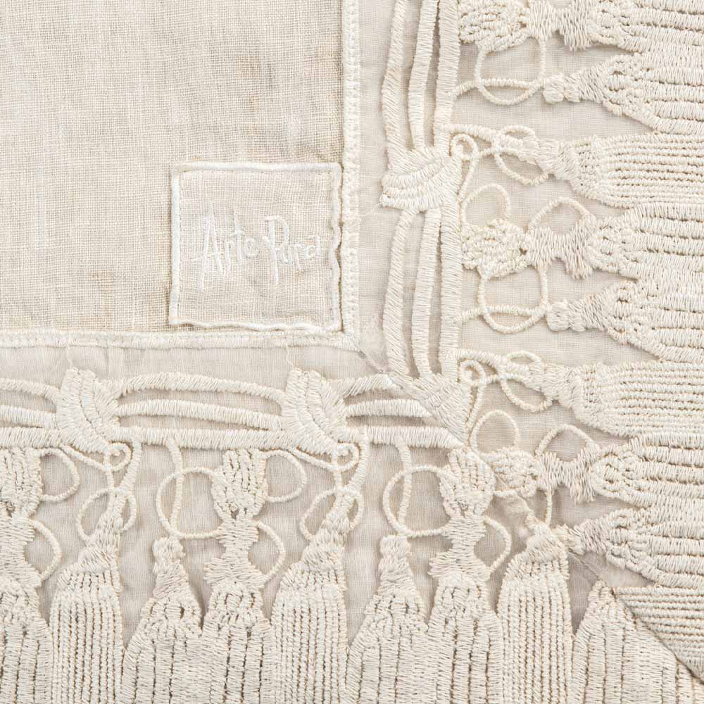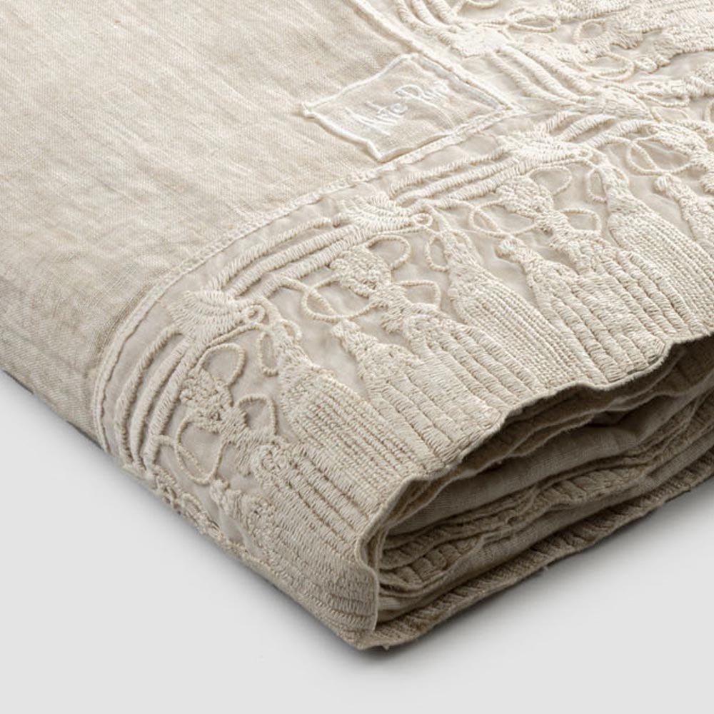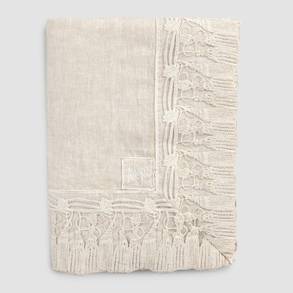 Mbulesë tavoline prej liri drejtkëndëshe me thekë dantelle, luks i punuar me dorë i prodhuar në Itali.