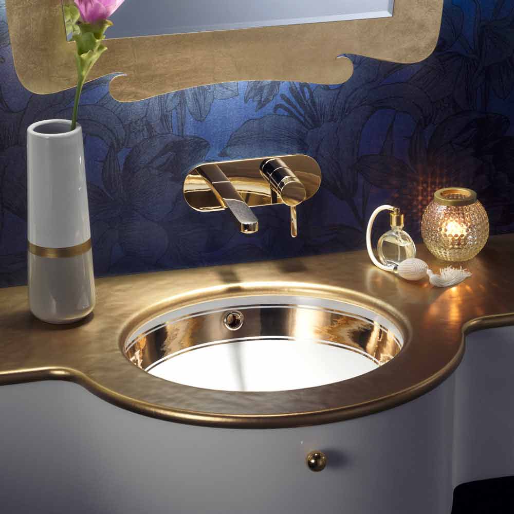Lavamani i banjës i bërë në Itali në argjilë prej argjile, i punuar me dorë në Itali me shirit dhe bishtalec në ar 24k.