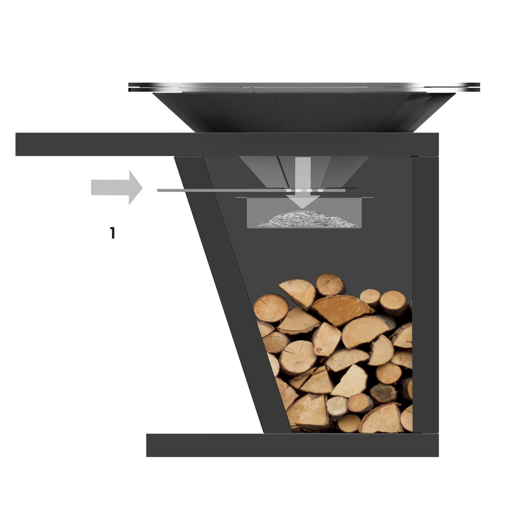 sirtar çeliku për mbledhjen e hirit, me nxjerrje të lehtë, në të cilën hiri do të bjerë pasi të keni shtypur levën e rregullimit të tifozit dhe të hapni të gjitha vrimat e ventilimit.