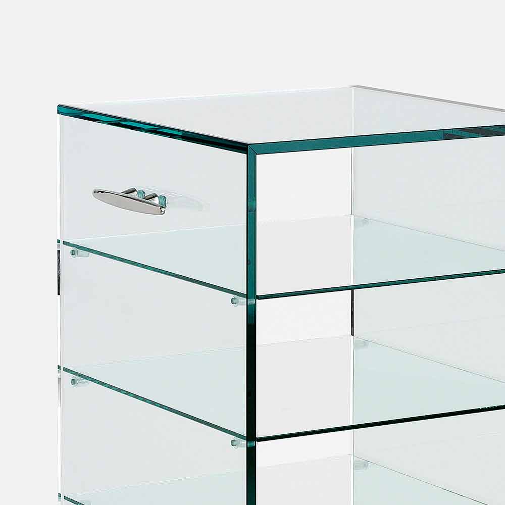 Ky raft revistash karakterizohet nga dizajni i tij i vendosur dhe elegant i bërë tërësisht nga xhami transparent.