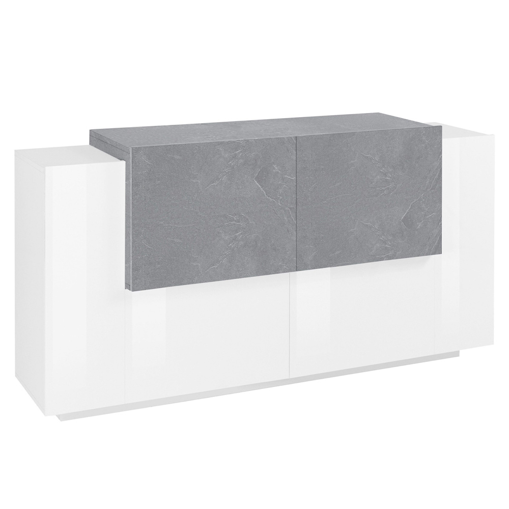 Dollapi për dhomën e ndenjes përbëhet nga 4 dyer gjithsej, 2 prej druri me llak të bardhë me shkëlqim dhe 2 me dru melamine panje ose rrasa, për të krijuar një kontrast sugjestionues dhe bashkëkohor. Për t'u vendosur në dhomën e ndenjes , dyert e përparme me shkëlqim tërheqin vëmendjen, duke krijuar një efekt elegant dhe elegant.