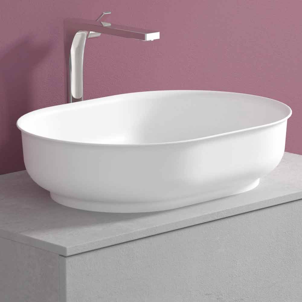 Ovale-formë countertop lavaman është bërë nga mat ngurta, një rrëshirë errët mineral i bardhë, dhe përfundoi në gelcoat errët, që e bën produkti i papërshkueshëm nga uji.