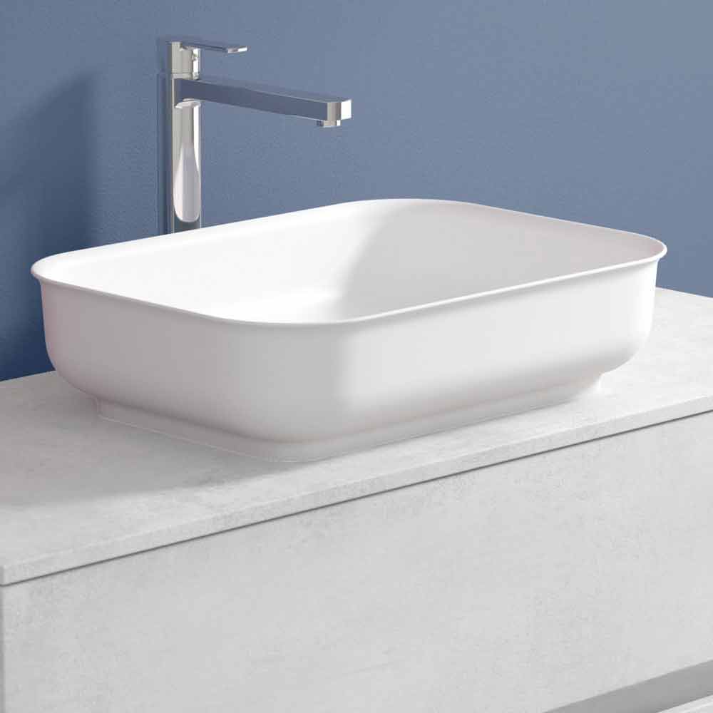 Countertop lavaman drejtkëndëshe është bërë nga mat ngurta, një rrëshirë errët mineral i bardhë, dhe përfundoi në gelcoat errët, që e bën produkti i papërshkueshëm nga uji.