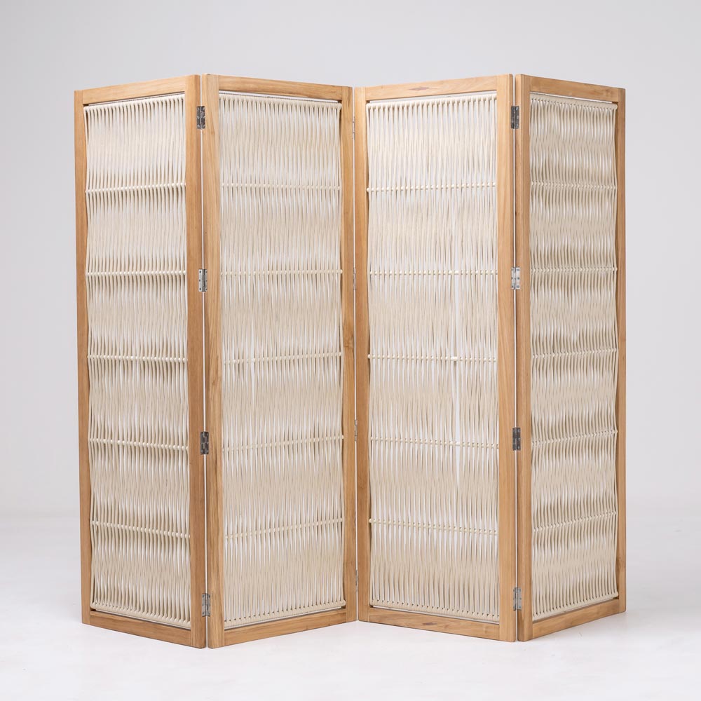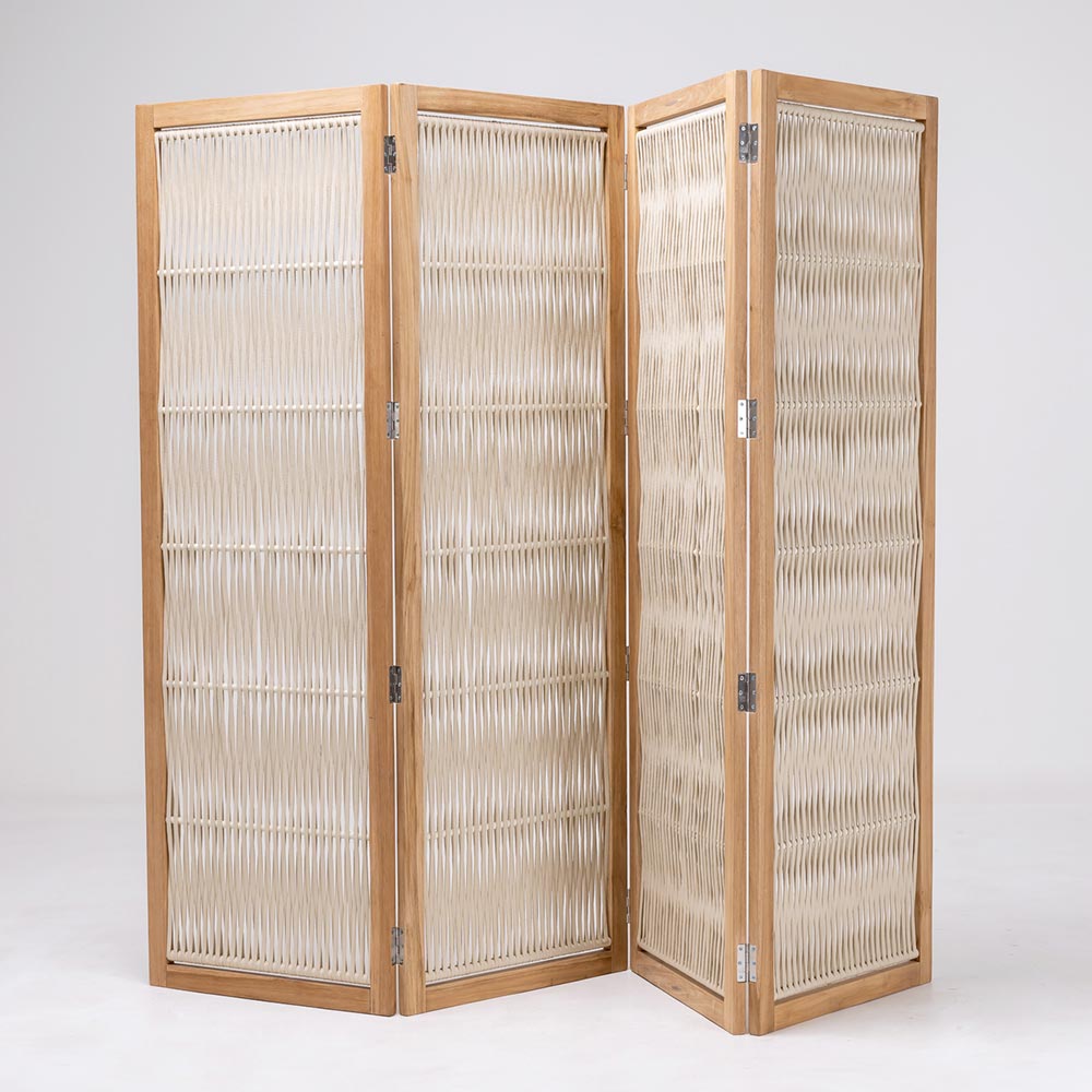 Ngjyra dhe tekstura e hapur e paneleve lejojnë që drita të filtrojë butësisht, duke krijuar hije që shtojnë një atmosferë relaksuese dhe mikpritëse në hapësirën tuaj. Falë menteshave të forta, kjo ndarëse e dhomës përshtatet lehtësisht në kënde të ndryshme, duke ju lejuar të personalizoni zonën sipas nevojave të momentit.