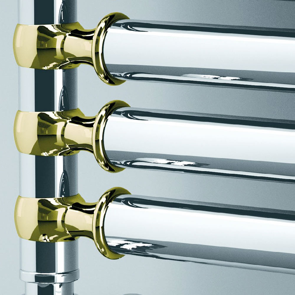 Ky radiator i sofistikuar çeliku është përkufizimi i elegancës dhe funksionalitetit. Dizajni i hollë dhe linjat e shumta horizontale jo vetëm që optimizojnë shpërndarjen e nxehtësisë, por gjithashtu ofrojnë një zgjidhje praktike si mbajtës peshqiri . Kombinimi i çelikut të lëmuar me detaje ari jep një prekje ngrohtësie dhe luksi, duke e bërë atë një plotësues të përsosur për banjot bashkëkohore ose klasike.