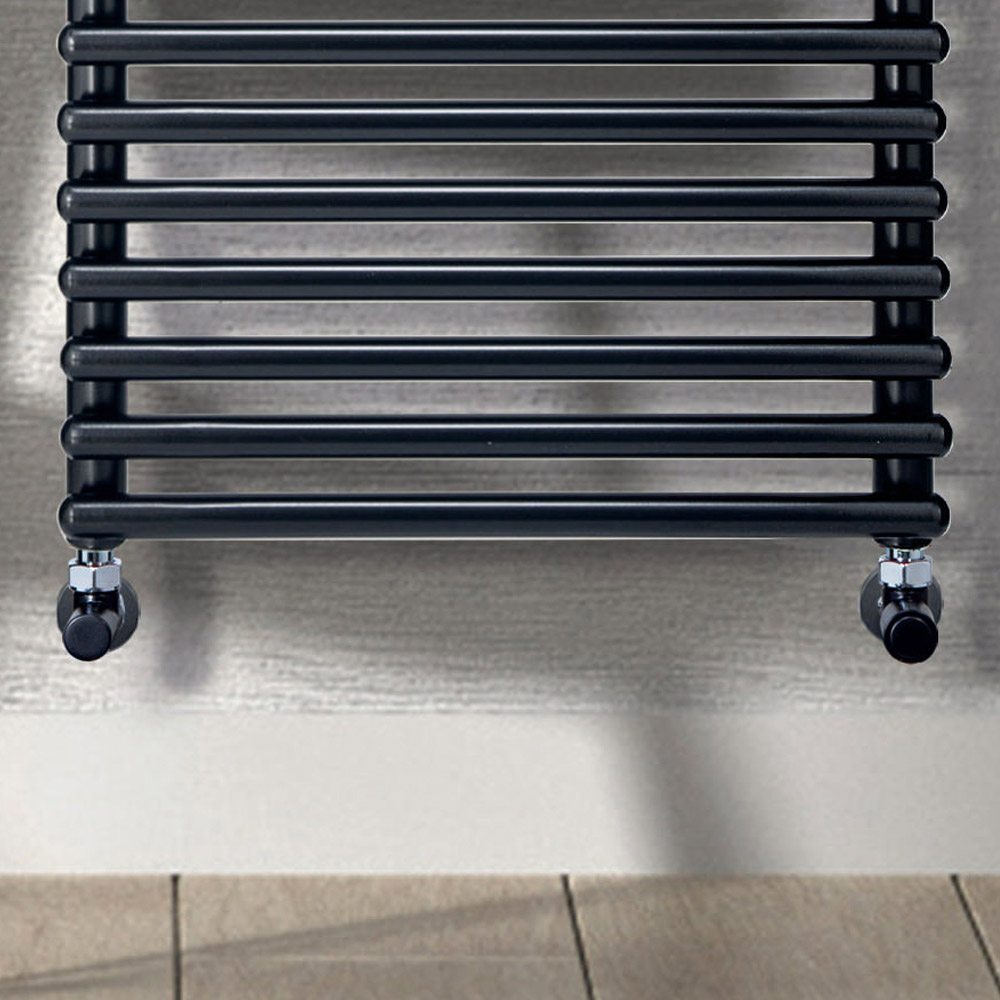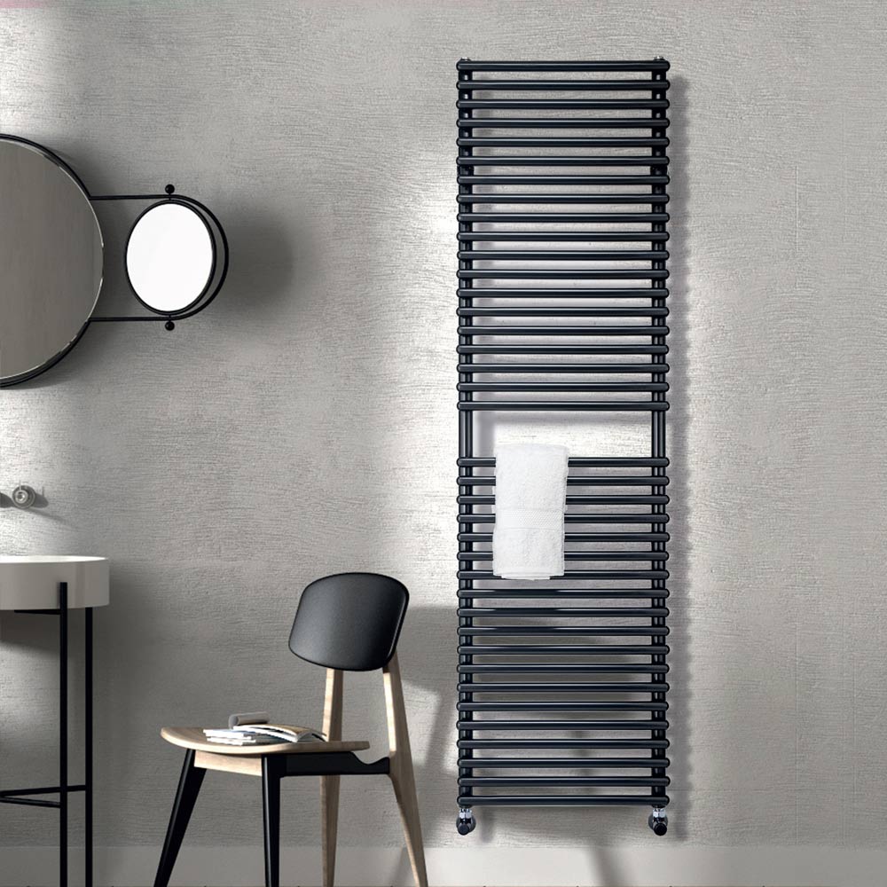 Ngrohëse hidraulike e peshqirëve në çelik karboni me finiturë të zezë jet e përbërë nga një seri elementësh horizontale me diametër 2,5 cm të salduara në kolektorë vertikalë me diametër 3,5 cm. Prodhuar tërësisht në Itali me komplet për fiksimin e murit, valvulën e ventilimit dhe spinën e verbër të përfshirë . Çdo fazë e prodhimit kryhet në një fabrikë pranë Trevisos, disa kilometra larg Venecias ku cilësia është objektivi konstant dhe i ndjekur. Cilësia është sinonim i vëmendjes ekstreme ndaj detajeve dhe zgjedhjes së materialeve me besueshmërinë më të mirë. Kështu lindi ky radiator me dizajn të pastër dhe funksionalitet në formën e tij më të lartë. Ky produkt ndërthur teknologjinë dhe prezencën formale, duke u bërë një objekt i vërtetë dizajni, një burim mirëqenieje dhe kënaqësie estetike. Është shumë më tepër se një burim i thjeshtë nxehtësie, është një mobilie e aftë për të personalizuar dhe plotësuar mjediset.