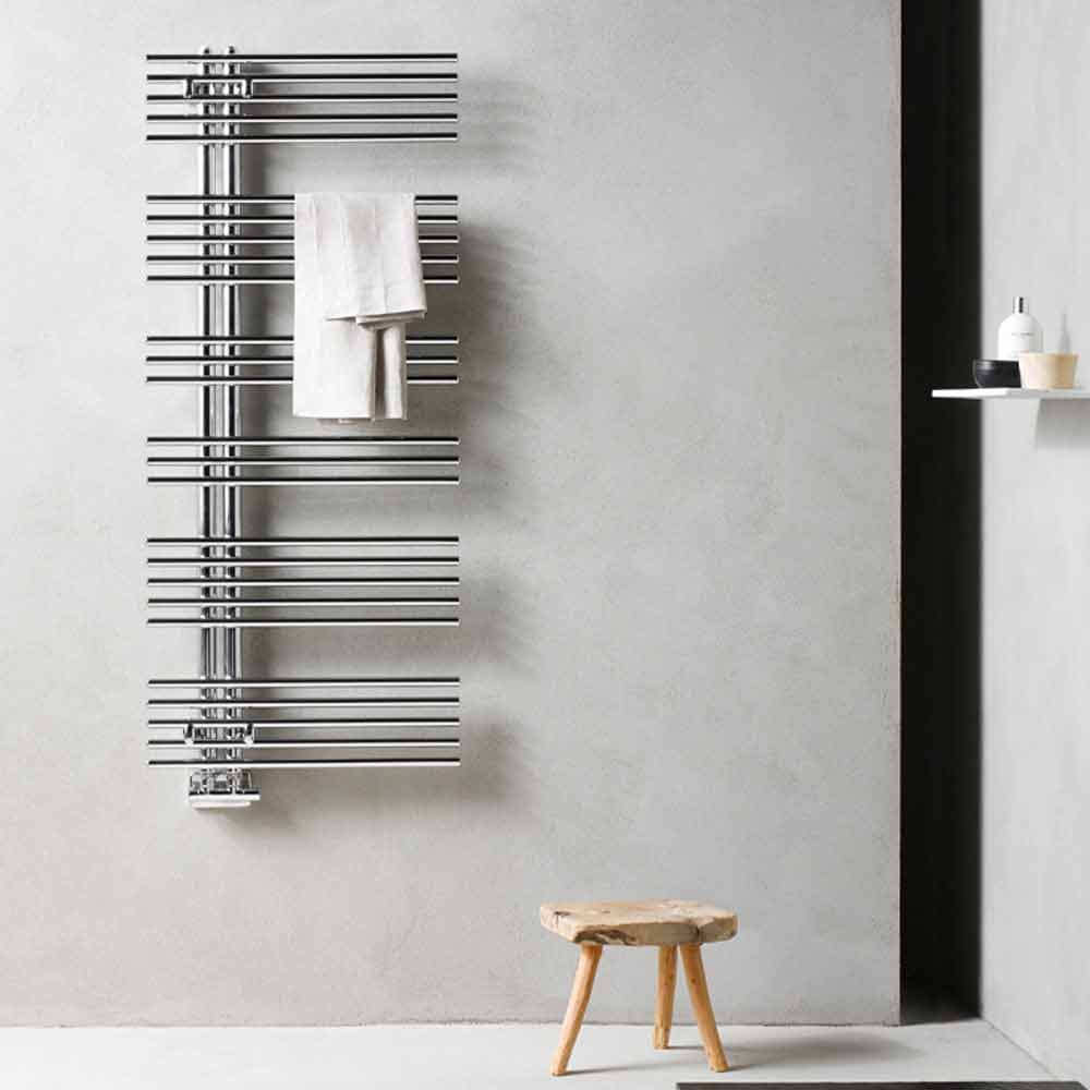 Projektoni një ngrohës hidraulik peshqiri të montuar në mur në çelik të kromuar, prodhuar në Itali.