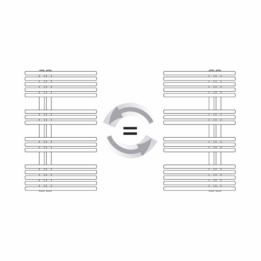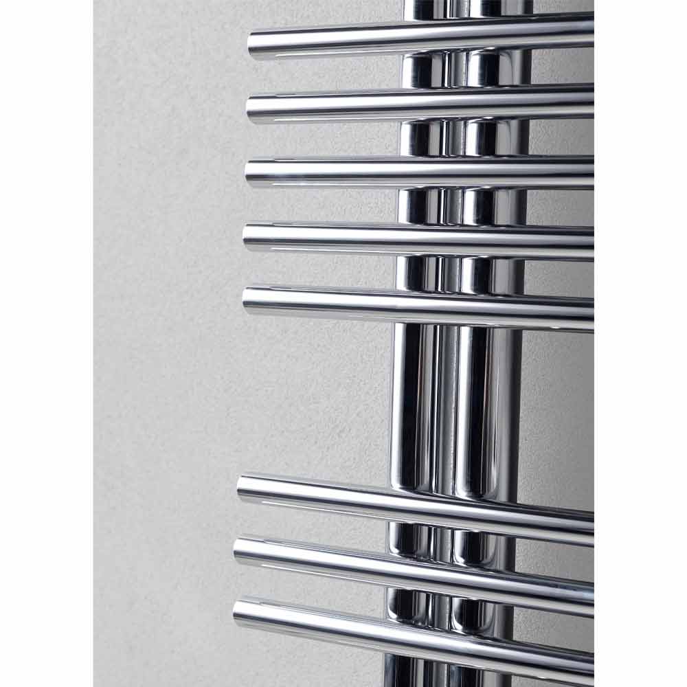radiator i ngrohtë me peshqir përmban një dizajn kromi të bërë me tuba vertikalë me diametër 35 mm dhe tuba horizontale me diametër 25 mm. Forma e tij moderne dhe e veçantë e bën atë të
