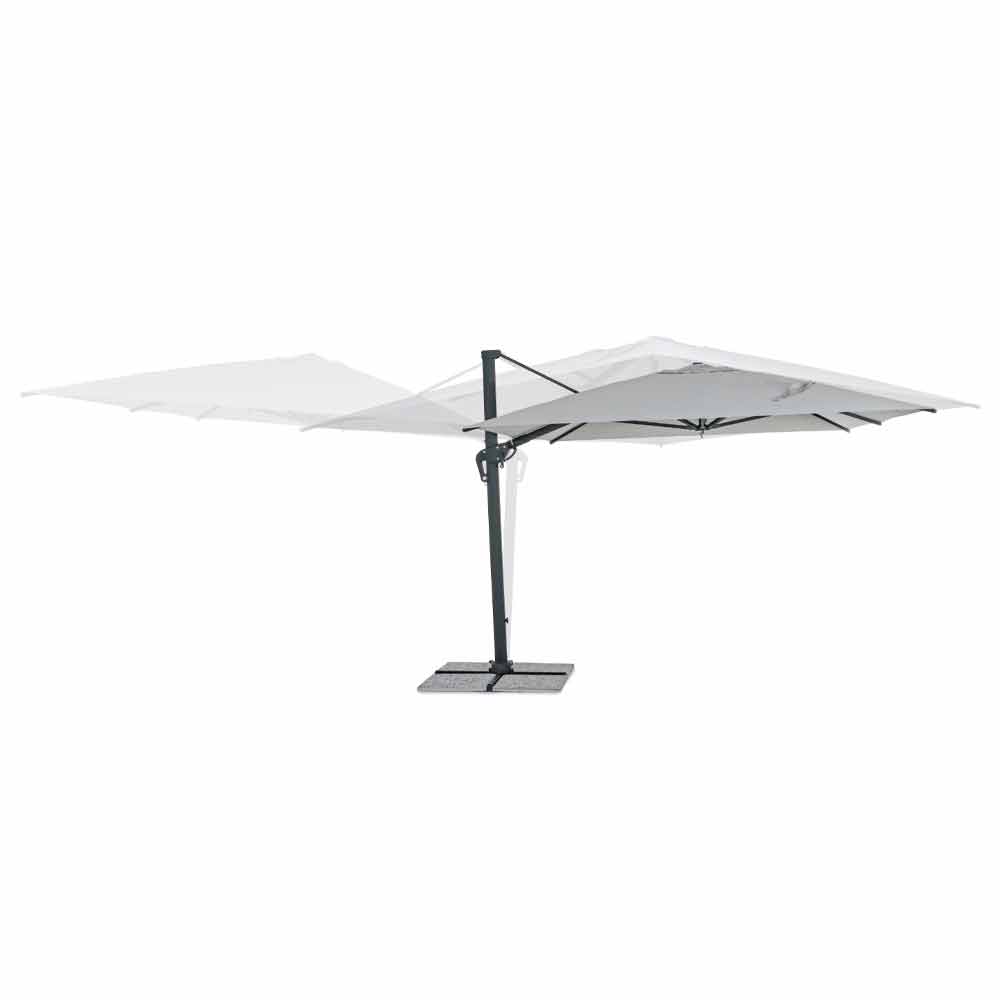 Struktura alumini e veshur me pluhur (poliester). Shtylla 93x57mm. 8 brinjë 28x18mm. Pëlhurë poliester gri e lehtë 250gr / m2 me veshje pa (poliamide). Baza kryq në çelik . Pol rrotullues 360 ° me pedale. Pjerrësia vertikale me dorezë me 5 pozicione. E pajisur me dorezë për animin e djathtë të majtë të ombrellës.
