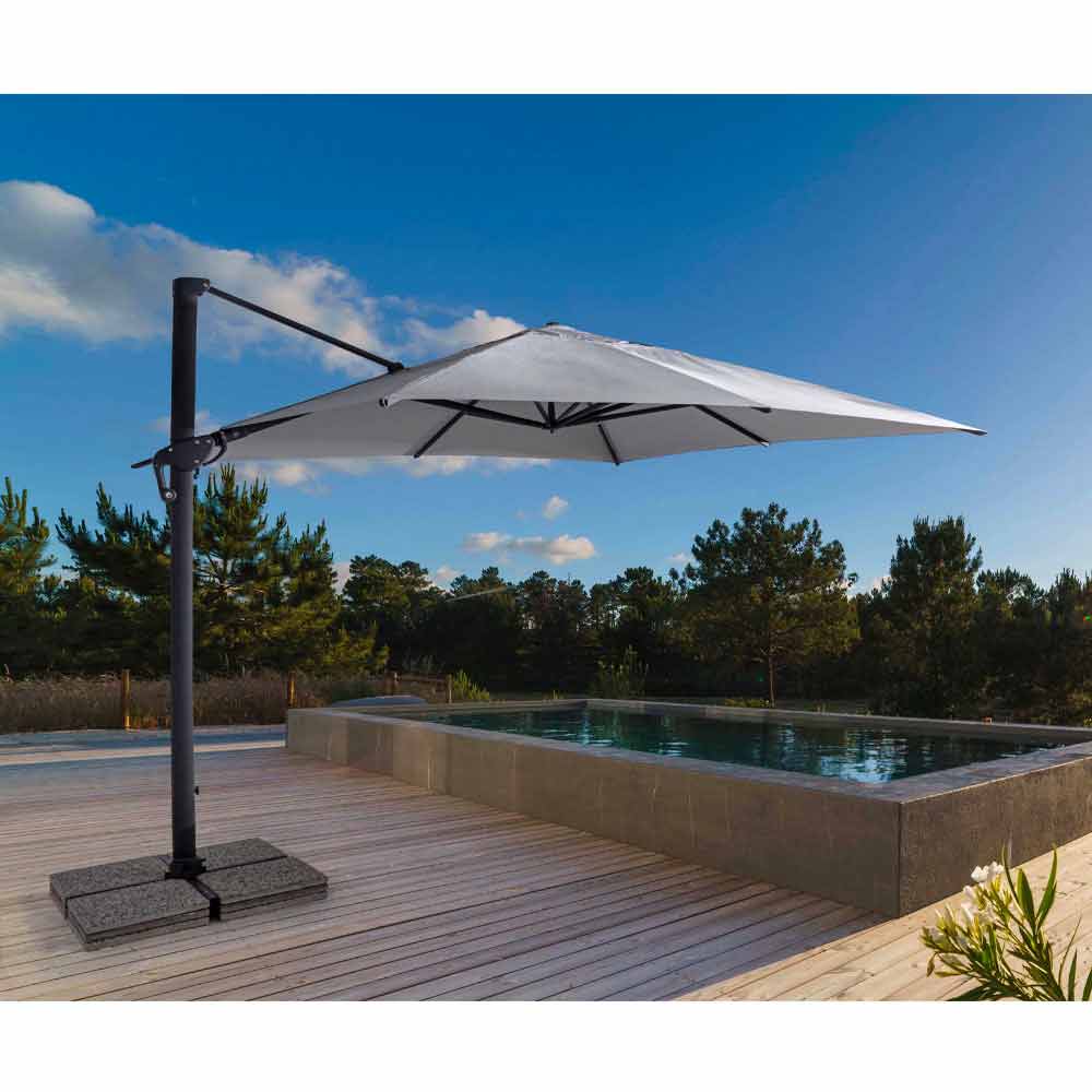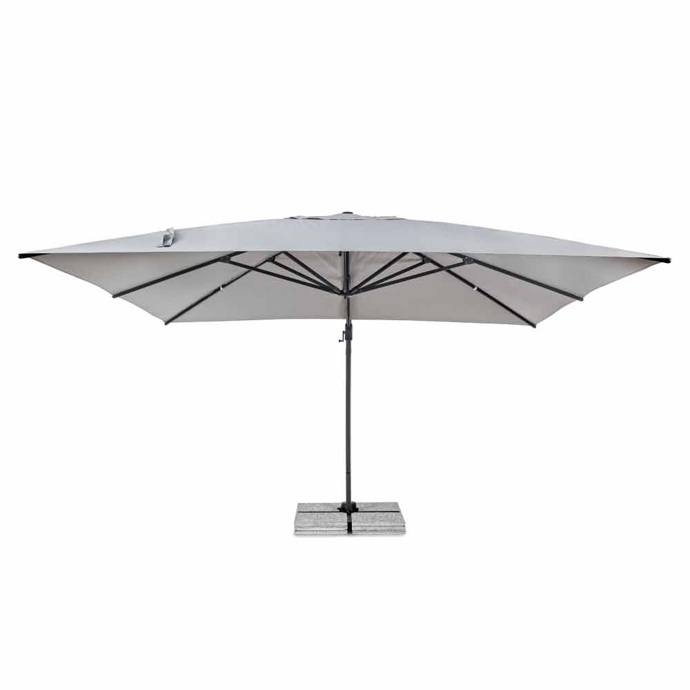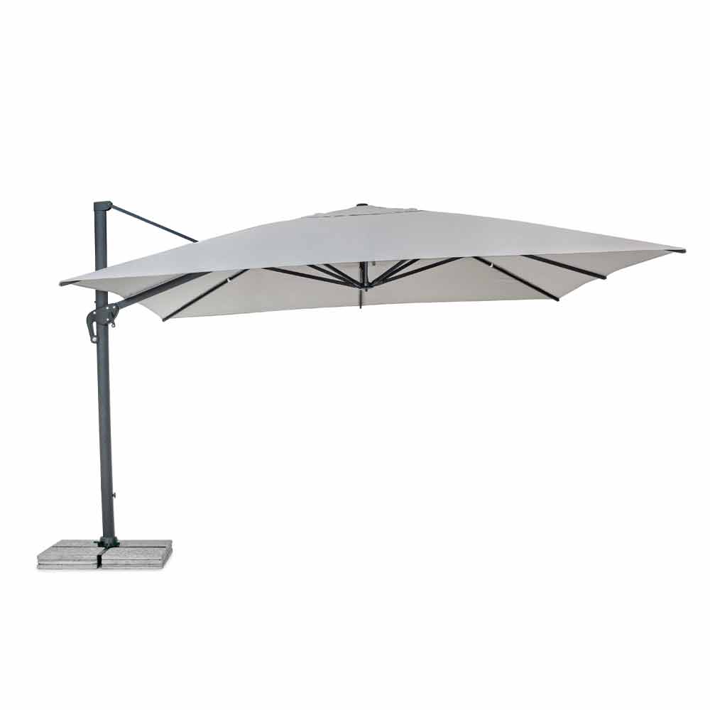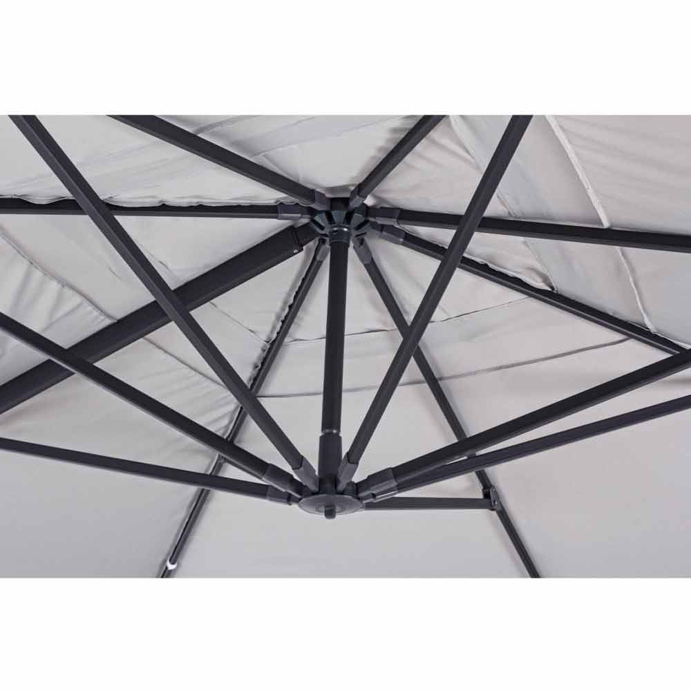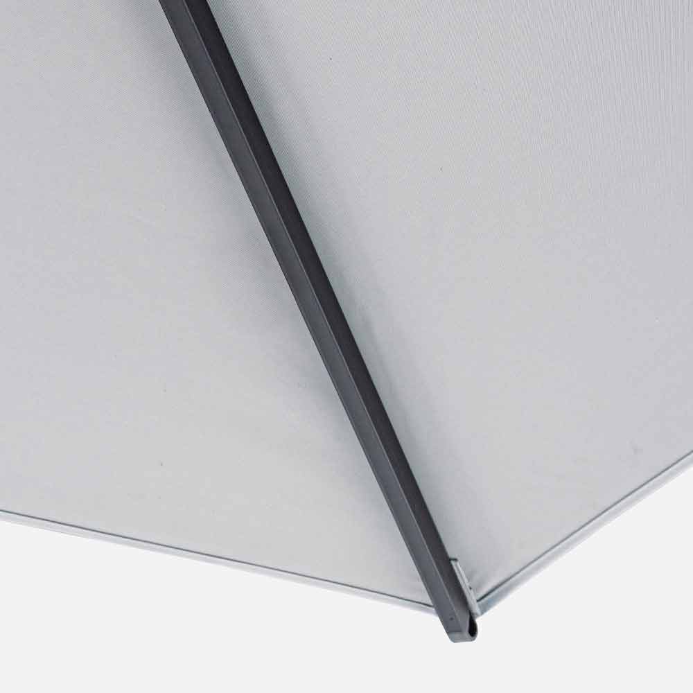 Struktura alumini e veshur me pluhur (poliester). Shtylla 93x57mm. 8 brinjë 28x18mm. Pëlhurë poliester gri e lehtë 250gr / m2 me veshje pa (poliamide). Baza kryq në çelik . Pol rrotullues 360 ° me pedale. Pjerrësia vertikale me dorezë me 5 pozicione. Përfshirë mbulesën e ombrellës.