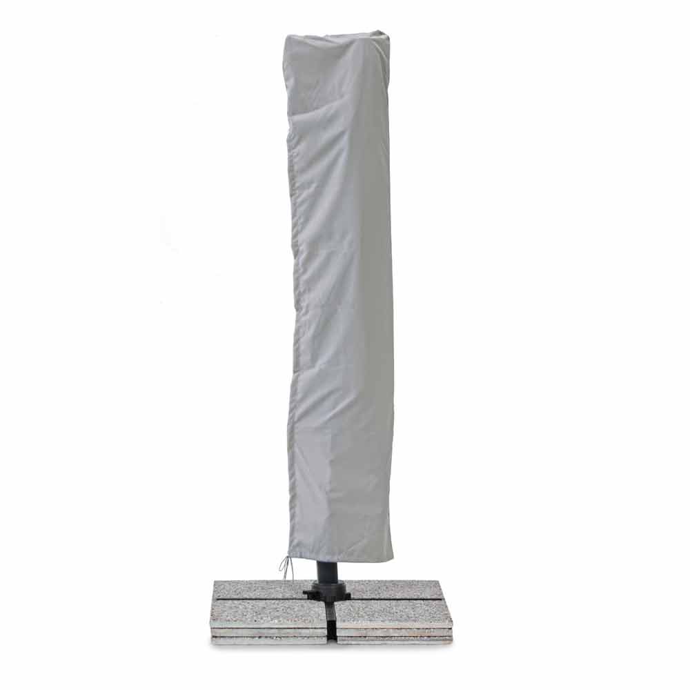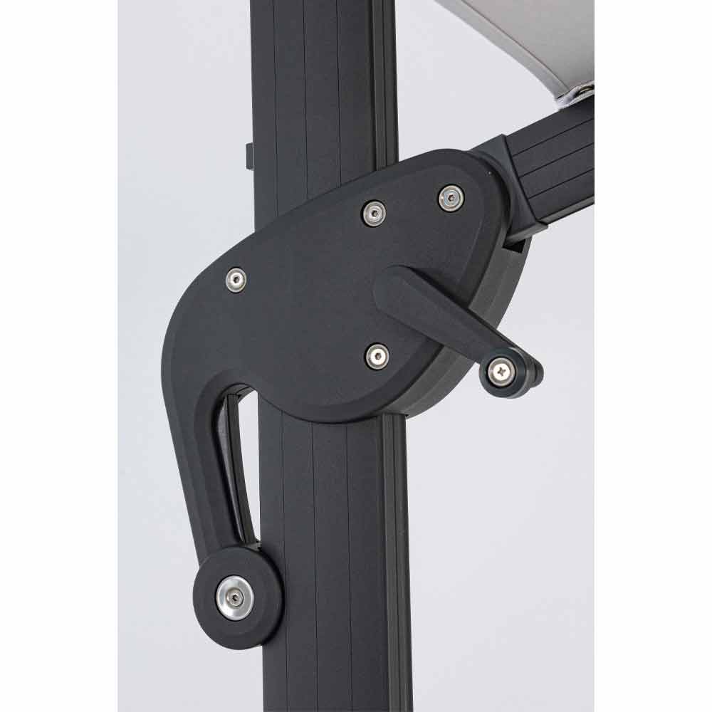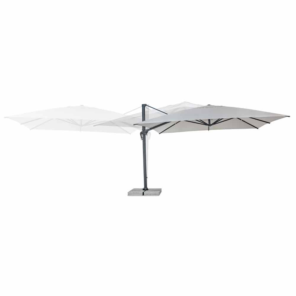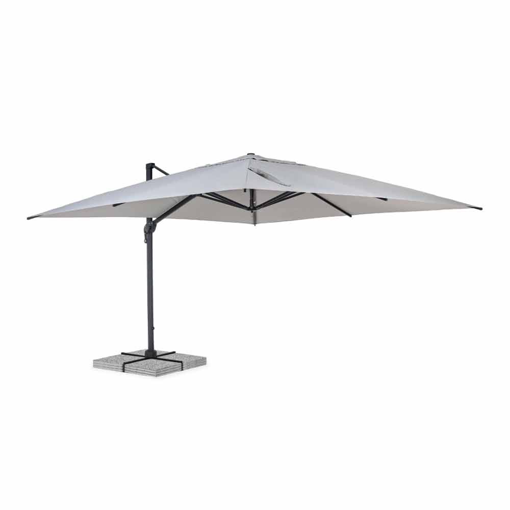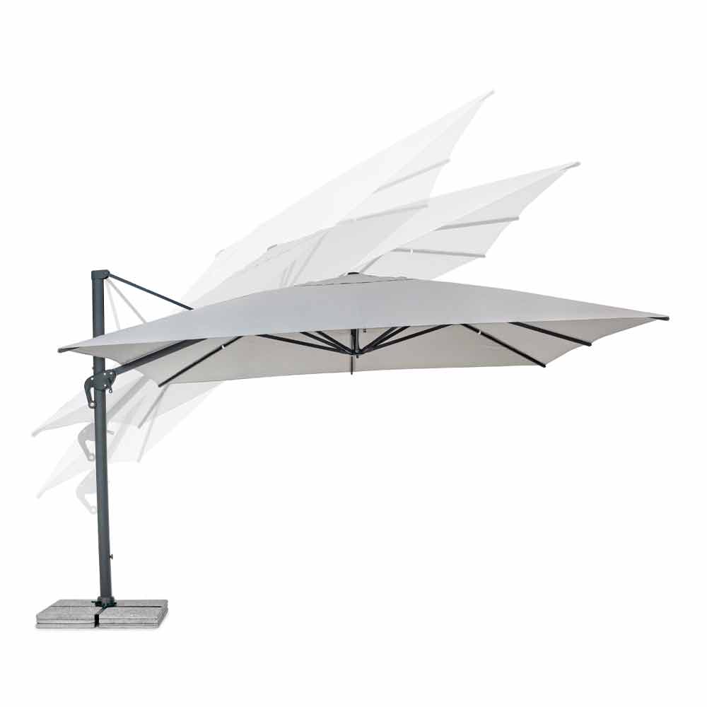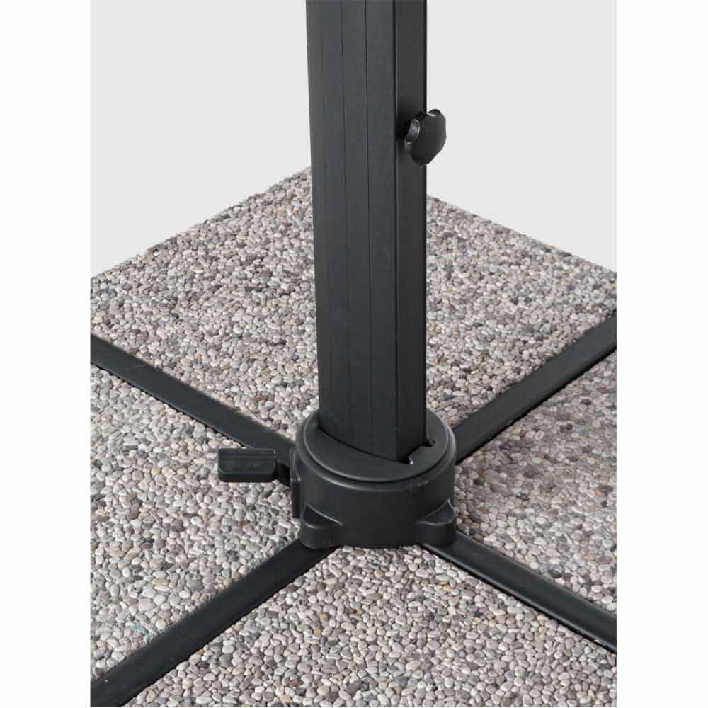 Struktura alumini e veshur me pluhur (poliester). Shtylla 93x57mm. 8 brinjë 28x18mm. Pëlhurë poliester gri e lehtë 250gr / m2 me veshje pa (poliamide). Baza kryq në çelik . Pol rrotullues 360 ° me pedale. Pjerrësia vertikale me dorezë me 5 pozicione. Përfshirë mbulesën e ombrellës.