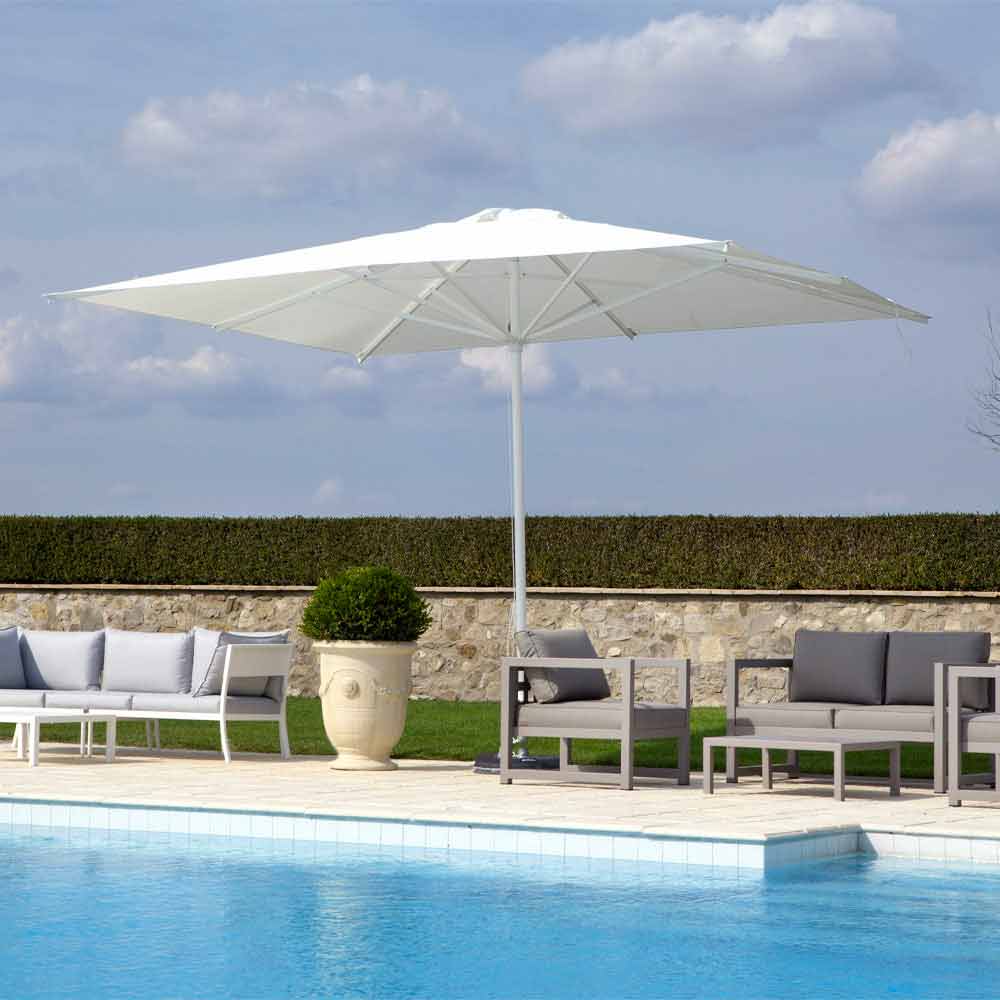 Çadra e kopshtit e bërë nga pëlhura akrilike dhe metali i veshur me pluhur, shtylla tuba prej alumini Ø60 mm, brinjë tubash prej alumini me lëshim të shpejtë të zbukuruara me brazda, kapakë plastikë PE, jakë najloni, kurorë dhe maje. Struktura e saj poli qendrore teleskopike ka një mekanizëm hapje / mbyllje rrotullimi dhe është i pajisur me një litar të thurur (100% poliester) dhe një mbështjellës litari për tu kyçur. E thjeshtë, funksionale dhe me një dizajn modern, kjo pjesë e mobiljeve përshtatet në çdo situatë të jashtme si pishina, kopshte dhe tarraca në një mënyrë të patëmetë, duke arritur të ofrojë mbrojtje të shkëlqyeshme ndaj veprimit të diellit dhe në të njëjtën kohë duke pasuruar estetikën të mjedisit në një mënyrë të thjeshtë dhe me personalitet. Baza nuk përfshihet.