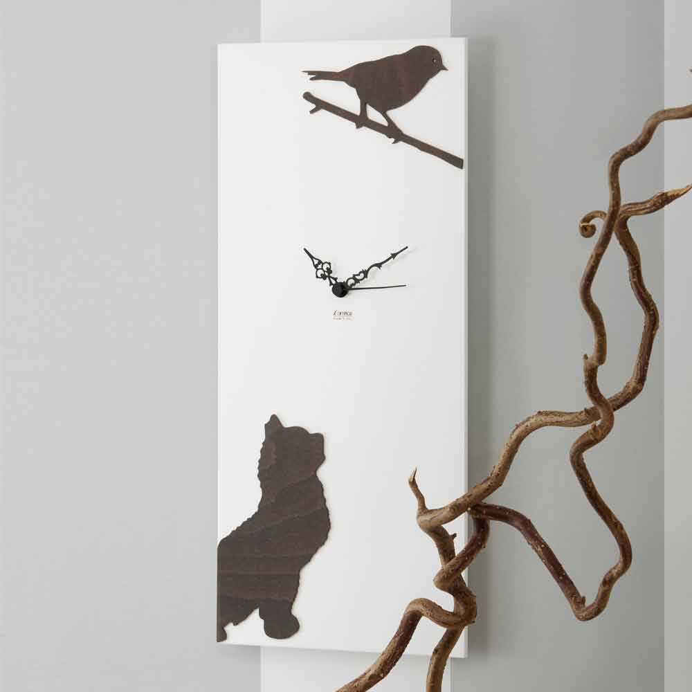 Ora drejtkëndëshe e murit në dru të bardhë mat me dizajn zogjsh dhe mace, dizajn modern të bërë në Itali