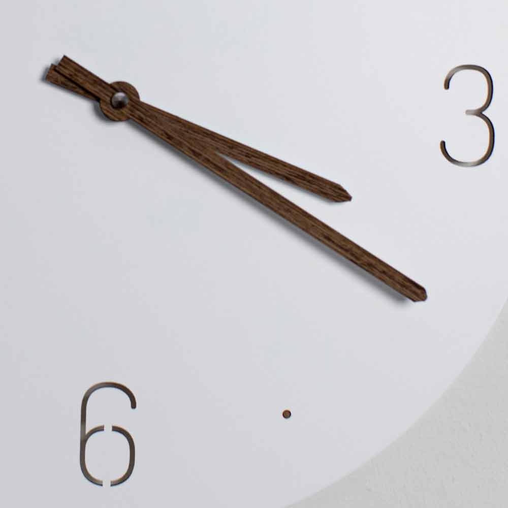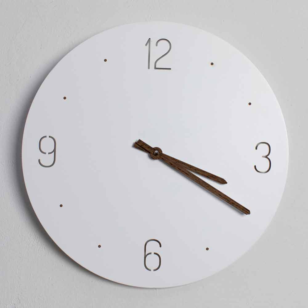 Ora me mur të rrumbullakët dhe themelor të projektimit në dru të bardhë me llak dhe lazer, të bërë në Itali.
