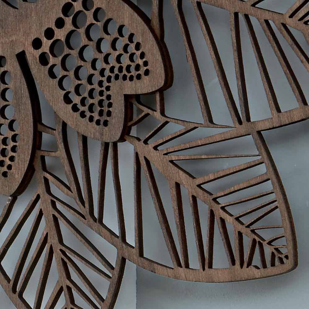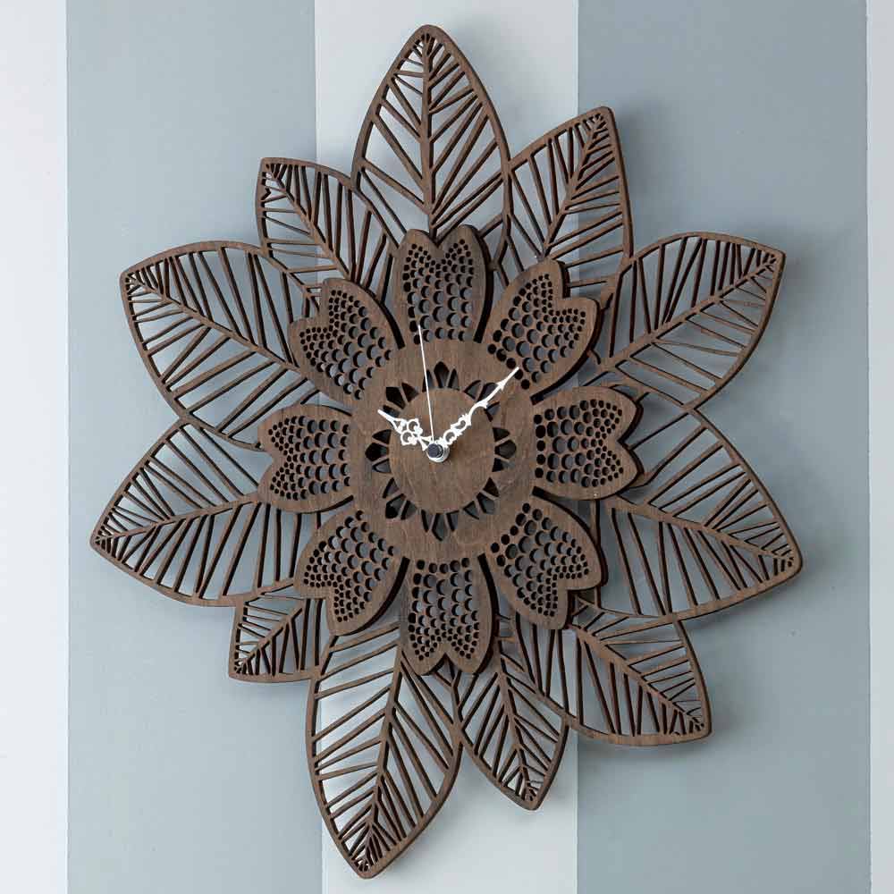 Një orë muri e veçantë, e bërë prejdruritë lehta ose të errët me prerje lazer, forma e së cilës i ngjan asaj të një luleje të sapokaluar.