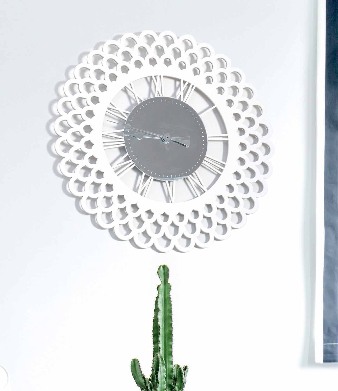 Një orë muri e veçantë, e bërë ngadrurii bardhë i prerë me lazer, forma e të cilit ngjan me atë të një lule të re që lulëzon.