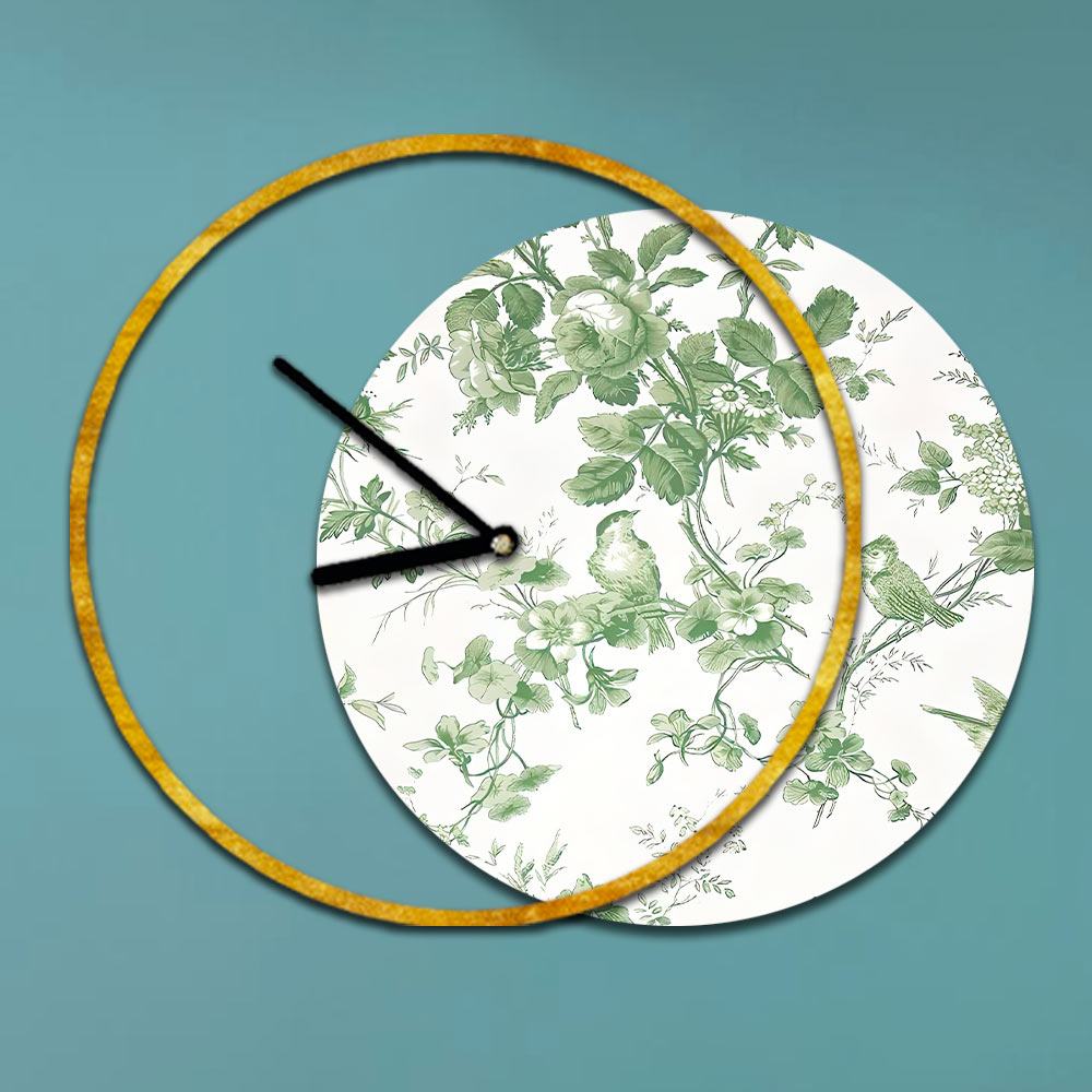 Orë me fletë ari dhe print me degë dhe zogj në nuancat e gjelbër