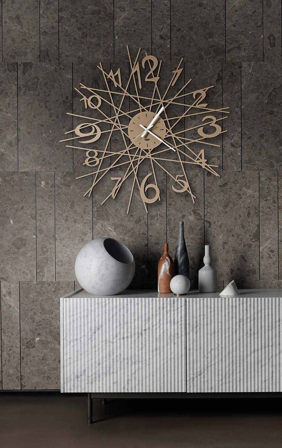 Kjo orë muri karakterizohet nga një dizajn gjeometrik dhe linja të thjeshta dhe të pastra që e bëjnë produktin elegant dhe të rafinuar, por në të njëjtën kohë ideal për t'i dhënë personalitet dhe karakter mjedisit.