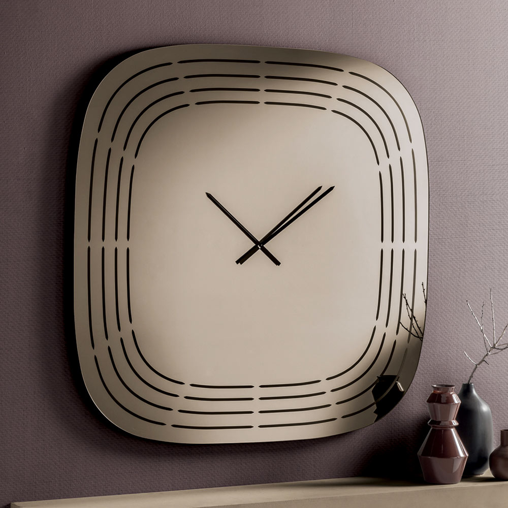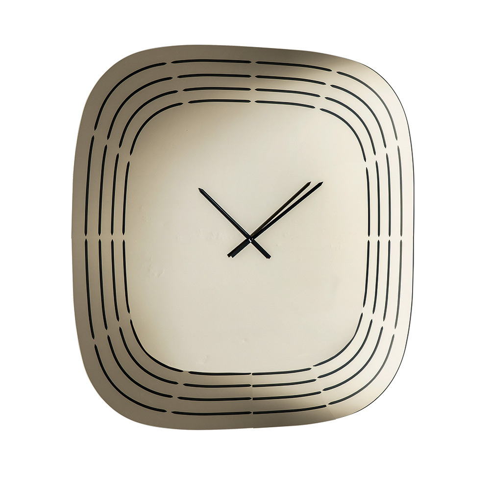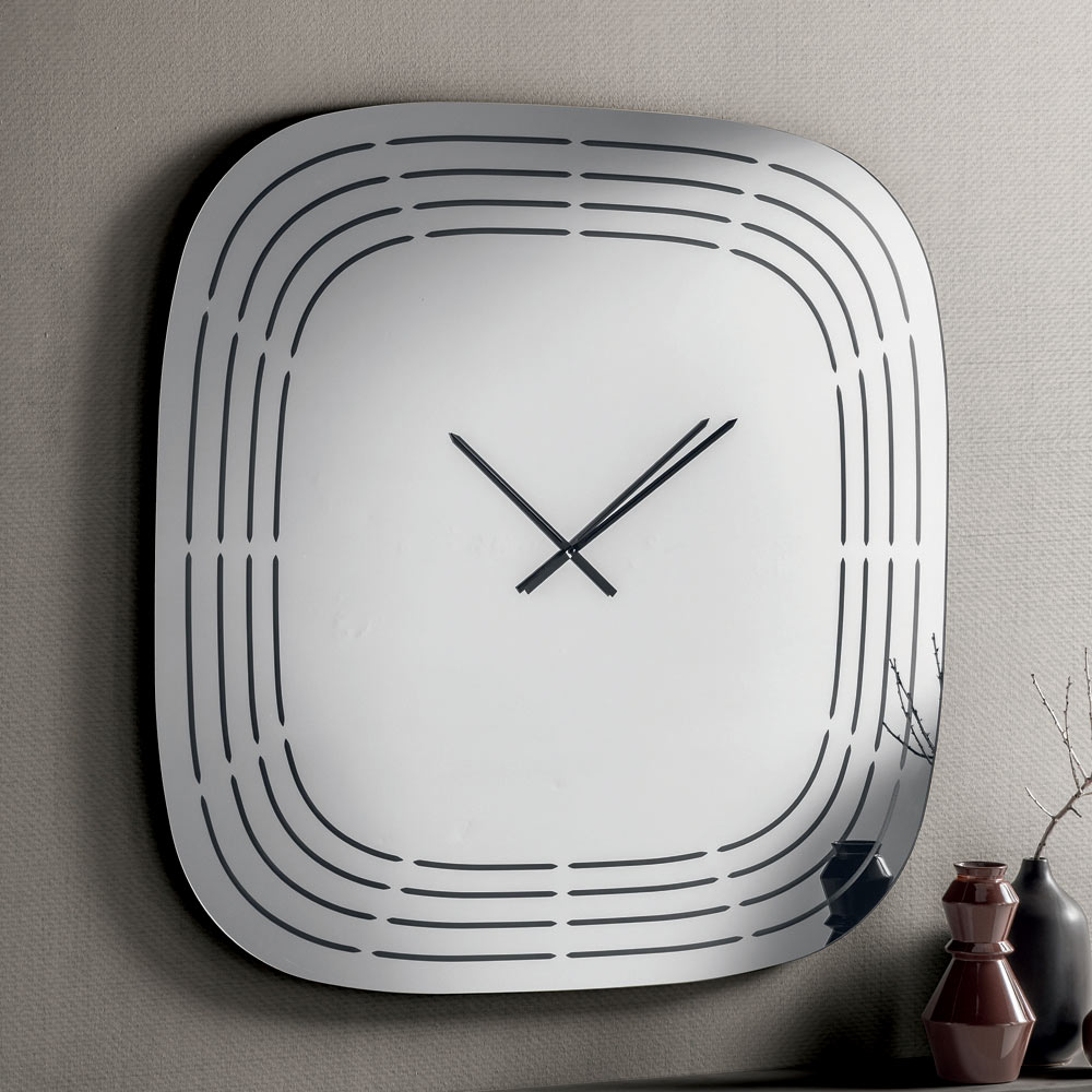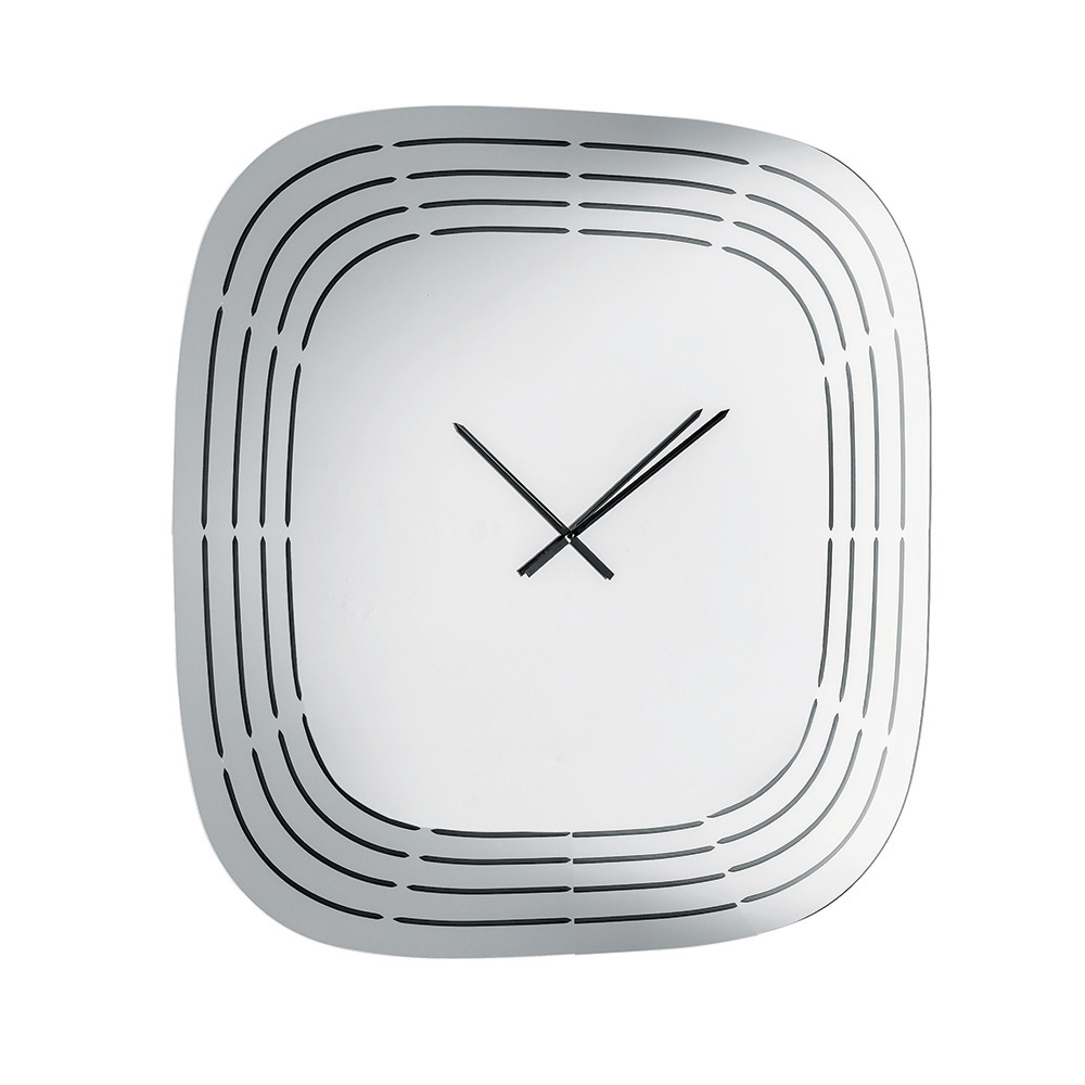 E punuar nga qelqi i pasqyruar , ora ka një formë katrore me cepa të rrumbullakosur që ia zbusin pamjen, duke e bërë vizualisht të ekuilibruar dhe moderne. Sipërfaqja është e zbukuruar me gravura me lazer që vizatojnë vija koncentrike duke ndjekur profilin e orës, duke lënë hapësirë në qendër për akrepat dhe duke krijuar një efekt grafik të rafinuar.