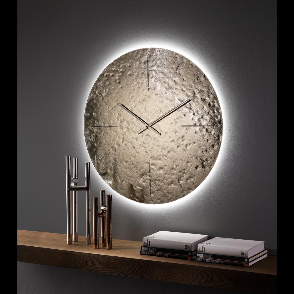 Një orë muri me një karakter të guximshëm dhe të sofistikuar, e projektuar për ata që dëshirojnë një element ekskluziv mobilimi të aftë për të pasuruar murin me dritë dhe material.