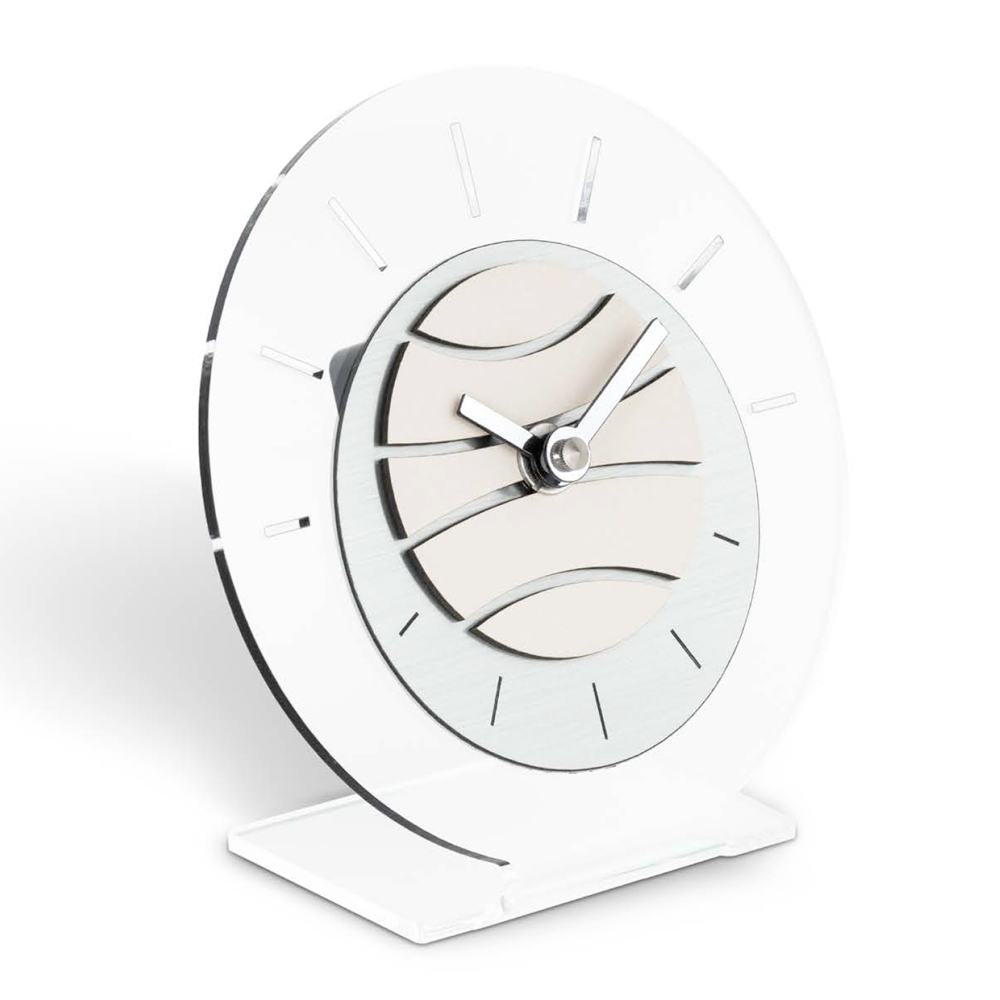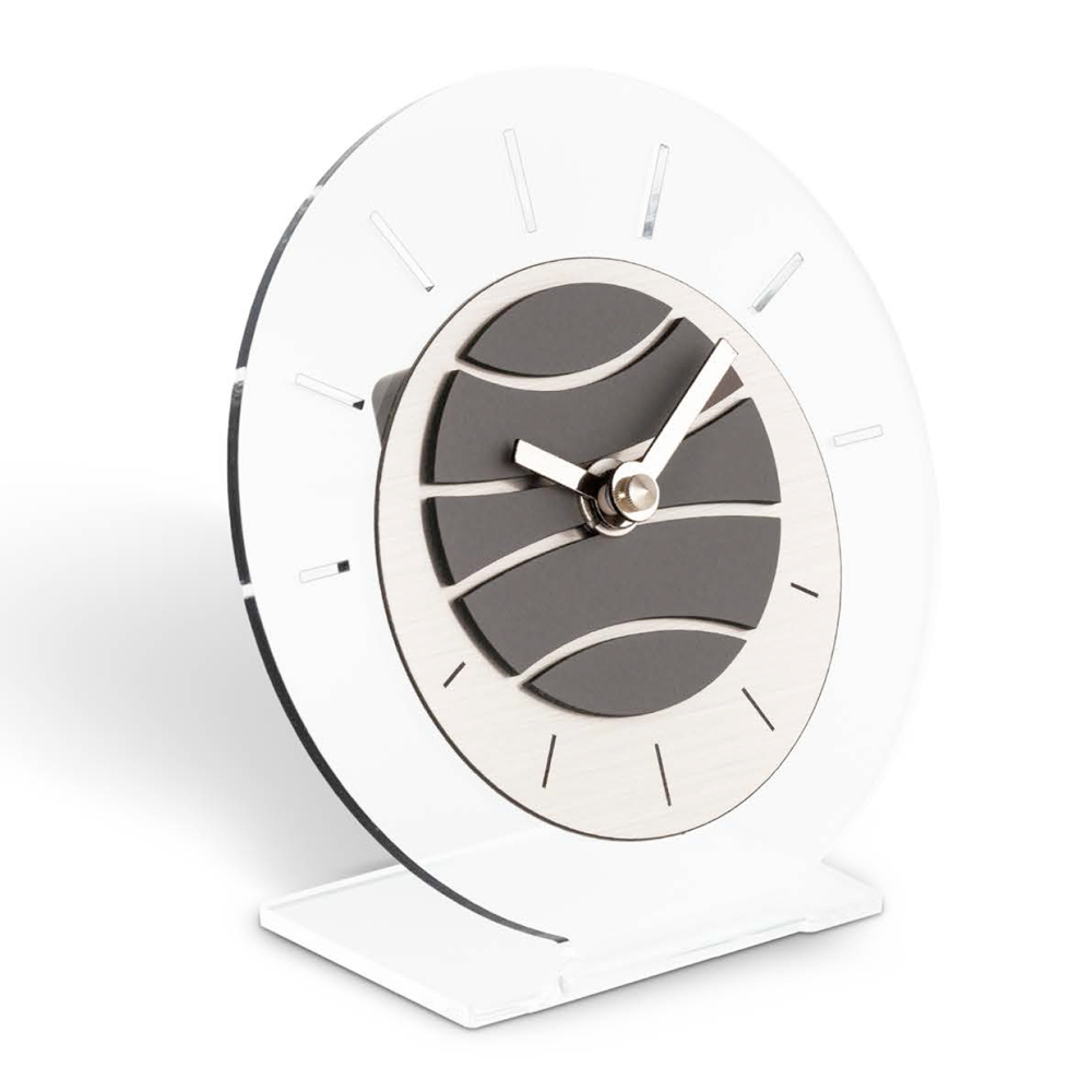 Kjo orë tavoline është një kryevepër e dizajnit dhe inovacionit modern . Me bazën e tij të qëndrueshme dhe çelësin rrethor, ngjall një ndjesi të kohës në pezullim . Duart lëvizin me hijeshi në një numërues që luan në alternimin e boshit dhe të plotë, duke ofruar një përvojë vizuale dinamike dhe unike .