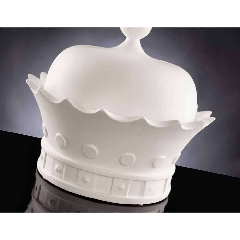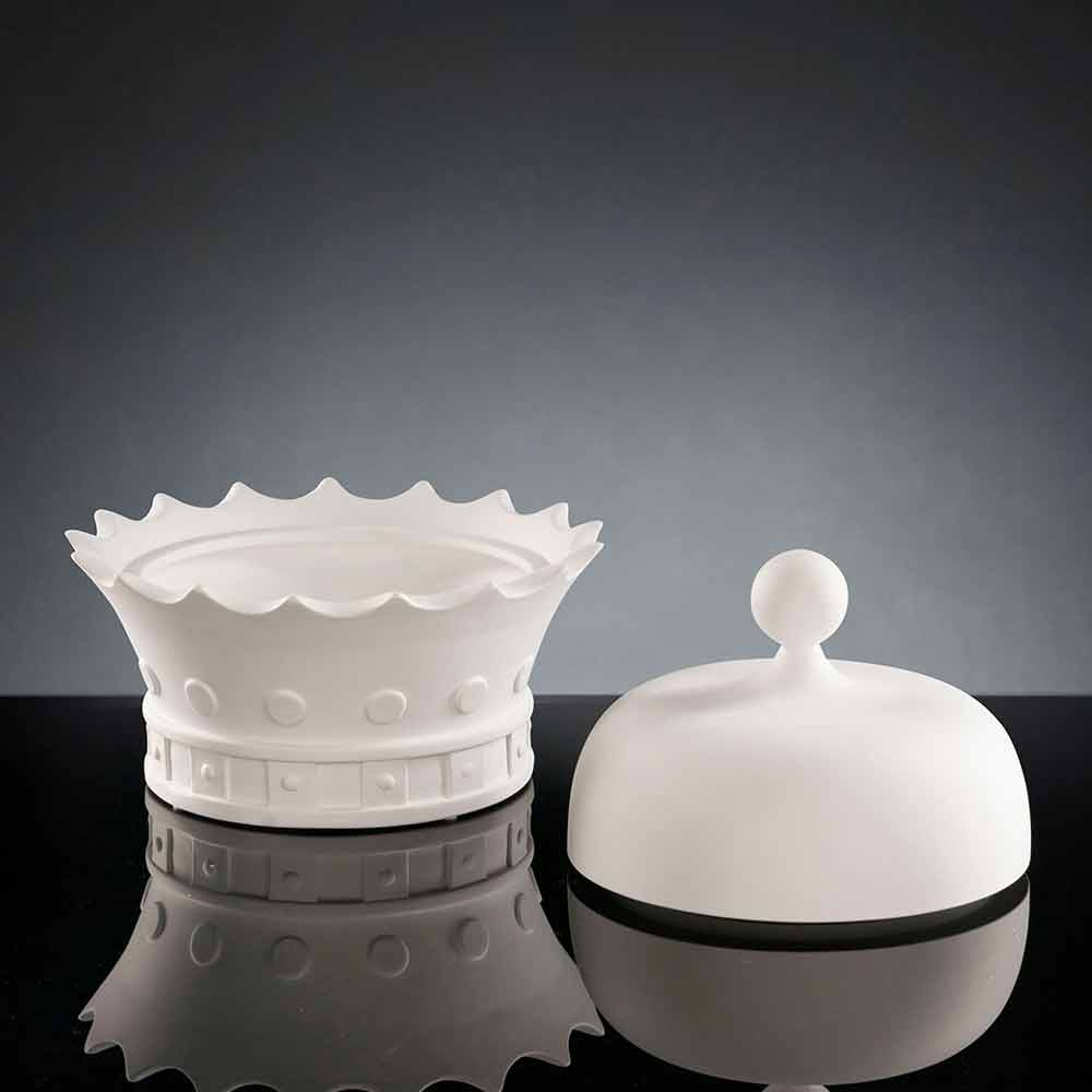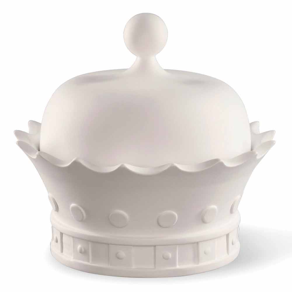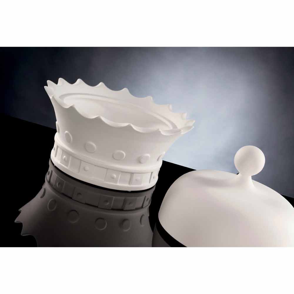 Statujë dekorative në formën e kurorës së një mbreti me hapje, prodhuar në Itali në qeramikë të punuar me dorë të bardhë. Një zbukurim i çuditshëm dhe elegant në të njëjtën kohë i aftë të kompletojë orenditë përreth duke krijuar një harmoni të mrekullueshme që mishëron modernizmin dhe dizajnin . Forma e saj origjinale dhe krijuese është ideale për ata që duan të pasurojnë hapësirat e tyre shtëpiake me elementë të karakterizuar nga një shpirt origjinal dhe unik ndërsa ofron një hapësirë të vogël në të cilën të mbërthehen dhe të organizohen disa objekte falë ndarjes praktike të pozicionuar nën kapak.