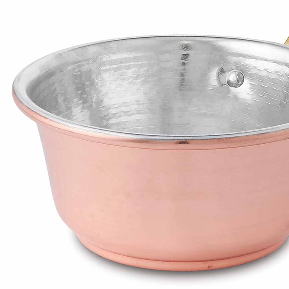 materiale me cilësi të shkëlqyer. Pra bakri i përdorur është bakër i pastër, me cilësitë e duhura fizike për modelim perfekt. Tunxhi për dorezat vjen nga shufra individuale të zgjedhjes së parë për derdhje artizanale dhe kallaji i përdorur është 100% i pastër i virgjër i përshtatshëm për përdorim ushqimor, në përputhje me rregulloret dhe me një certifikatë analize.