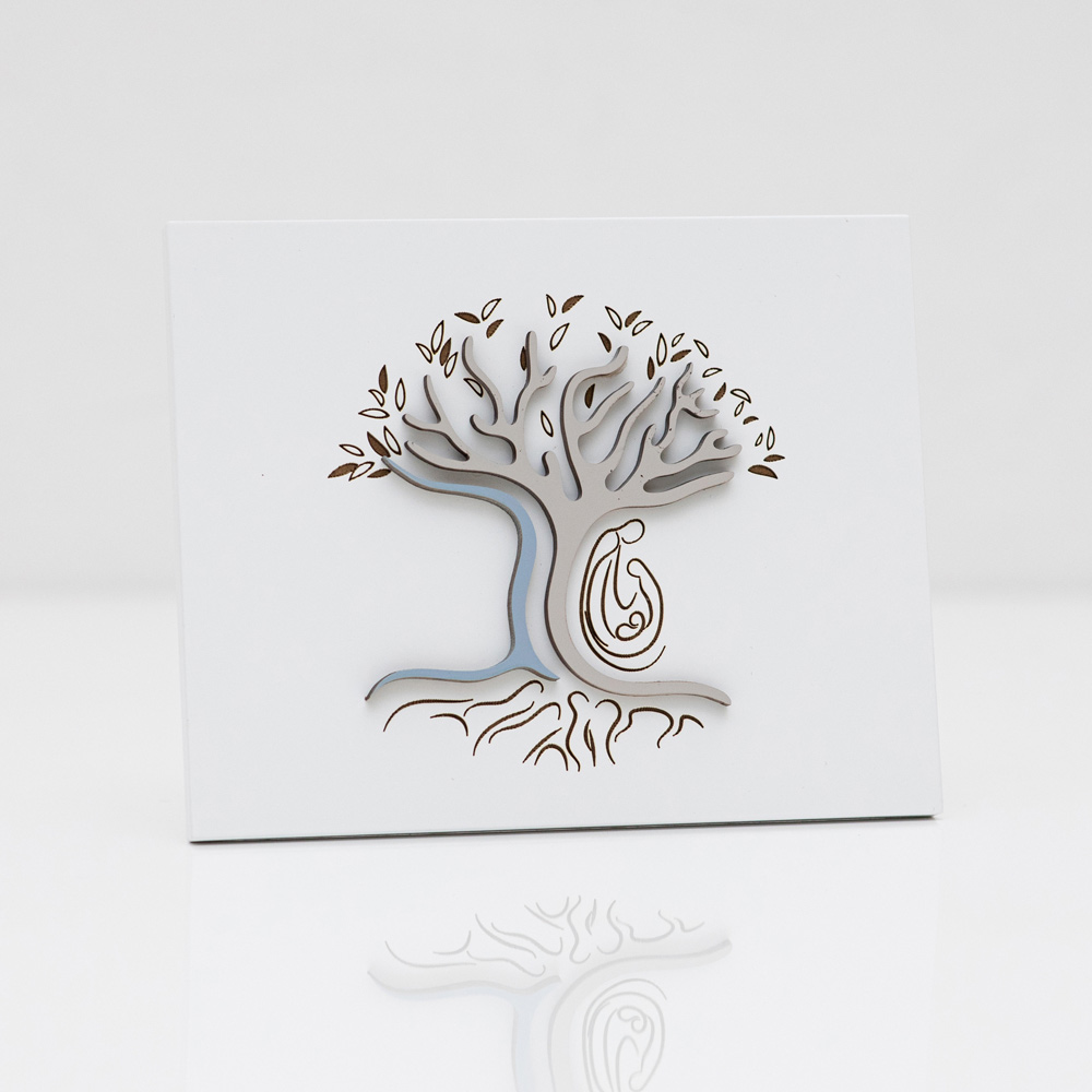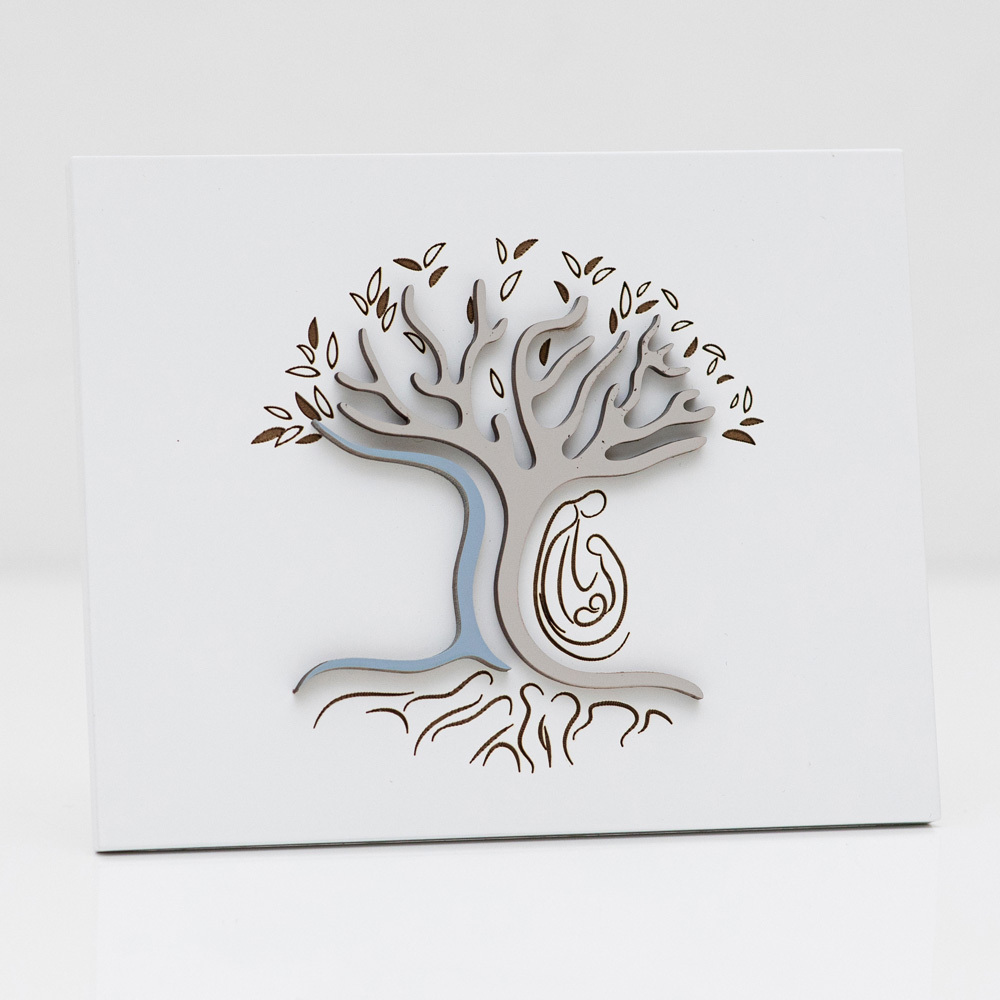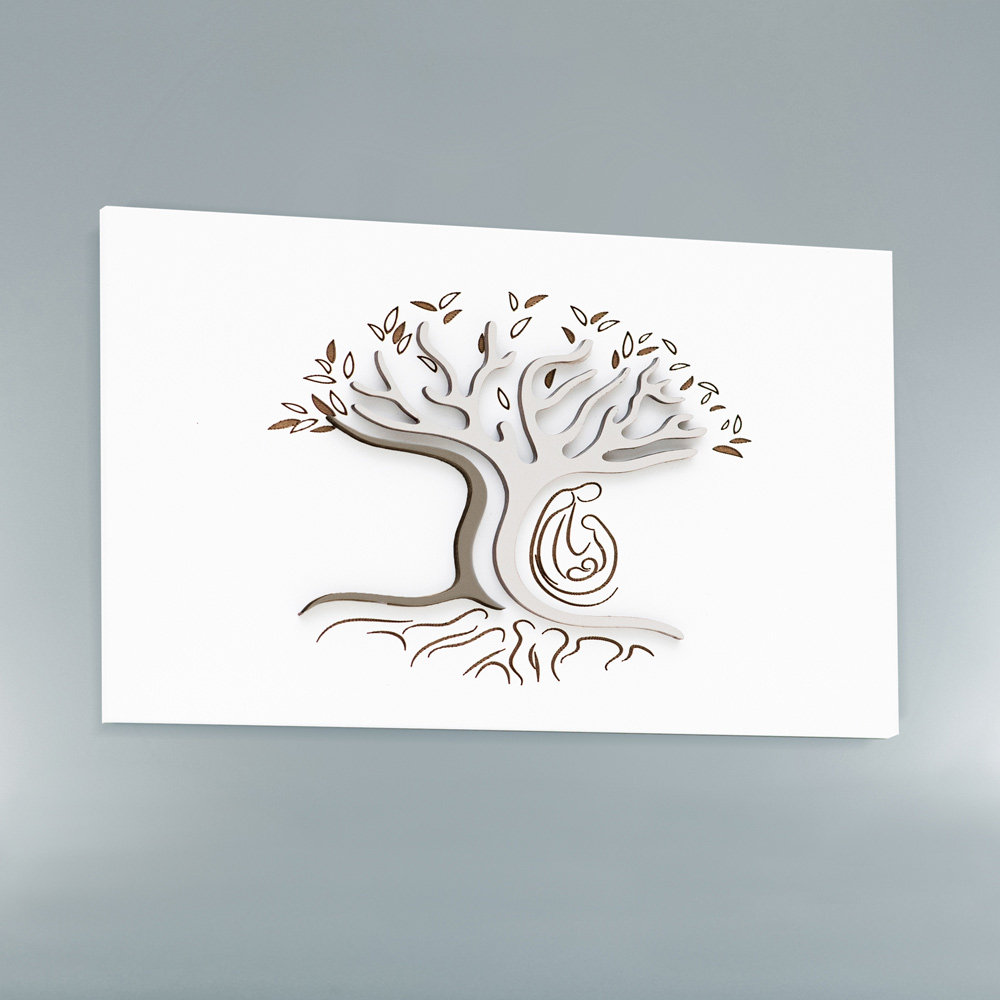 Paneli dekorativ që përfaqëson pemën e jetës me familjen falë kombinimit të shkathët të shënjimit dhe prerjes me lazer. Kornizë në dru të bardhë mat me llak me aplikime në dru të llakuar në nuanca të ndryshme .