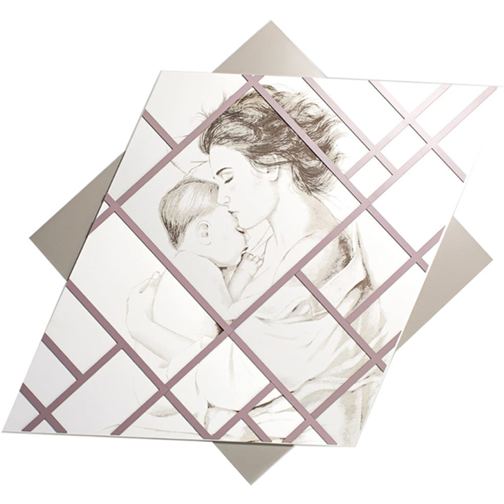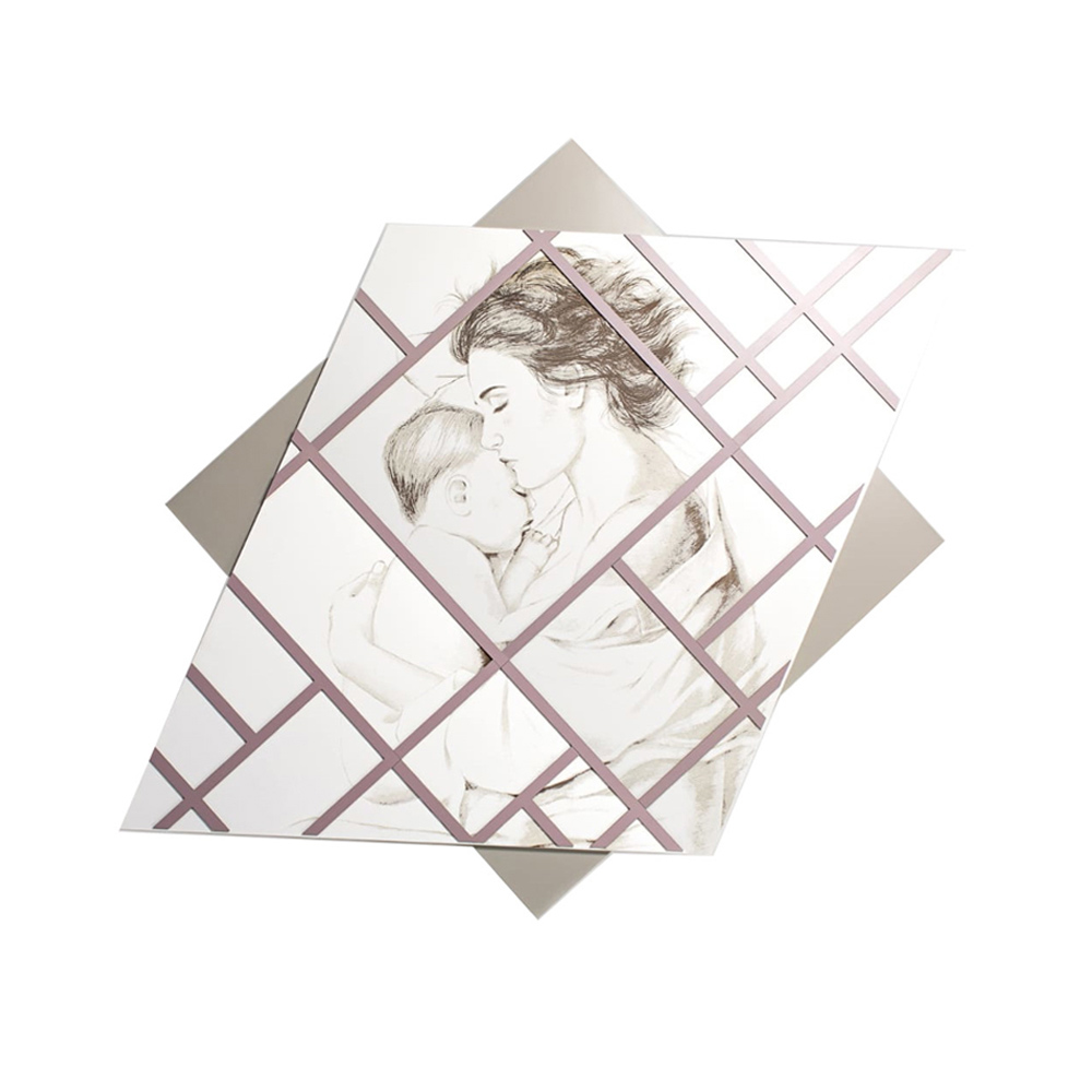 Një ballë krevati që përshkruan amësinë me një përqafim midis nënës dhe fëmijës falë shënjimit me lazer, i cili tregon tiparet e fytyrave. Panele druri me llak të bardhë mat me markim lazer, një teknikë e veçantë që krijon një reliev mbi materialet. Paneli është i gdhendur në një panel ngjyrë guraleci dhe është i dekoruar në ngjyrën tuaj kadife ose rozë kakao .