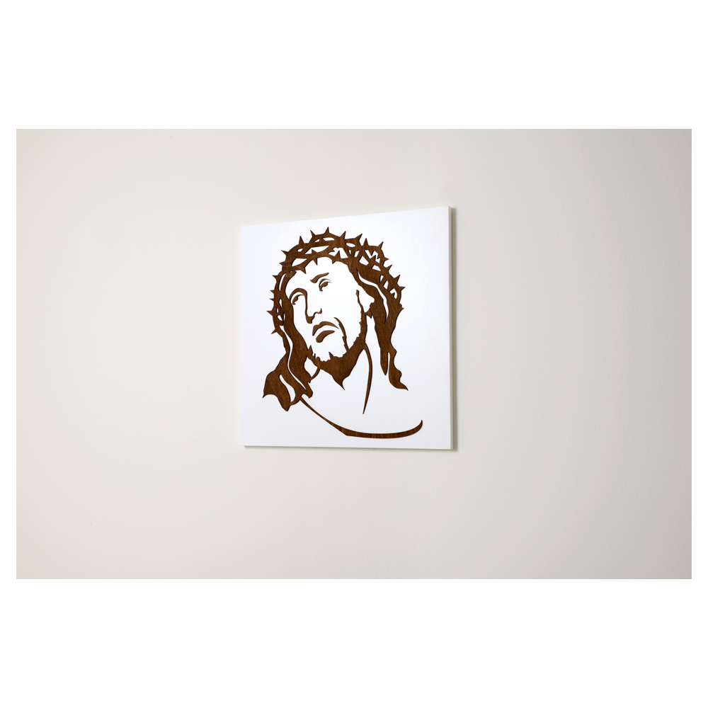 Kornizë e shenjtë në dru të bardhë me llak me aplikim të fytyrës së Krishtit në dru wengé.