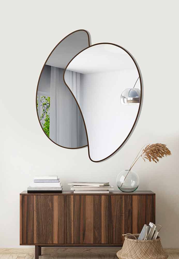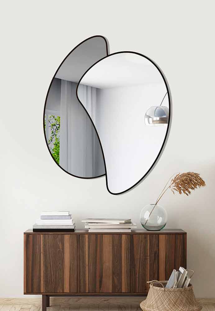 Kjo pasqyrë e murit minimalist është e përbërë nga dy pasqyra, njëra prej të cilave është një ngjyrë e tymosur, me linja elegante dhe forma moderne të kombinuara me përfundime të rafinuara me llak për një rezultat me një ndikim estetik minimal dhe dekorativ, në një stil unik.